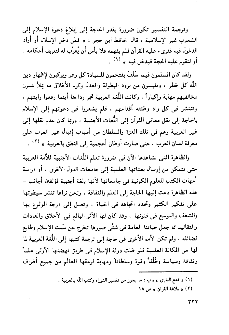 والظاهرة التي نشاهدها الآن في ضرورة تعلم اللغات الأجنبية للأمة العربية حتى تتمكن من إرسال بعثاتها العلمية إلى جامعات الدول الأخرى، أو دراسة أمهات الكتب للعلوم الكونية في جامعاتها؛ لأنها بلغة أجنبية لمؤلفين أجانب - هذه الظاهرة دعت إليها الحاجة إلى العلم والثقافة، ونحن نراها تنشر سيطرتها على تفكير الكثير وتحدد اتجاهه في الحياة، وتصل إلى درجة الولوع بها والشغف والتوسع في فنونها، وقد كان لها الأثر البالغ في الأخلاق والعادات والتقاليد مما جعل حياتنا العامة في شتى صورها تخرج عن سَمت الإسلام وطابع فضائله، ولم تكن الأمم الأخرى في حاجة إلى ترجمة كتبها إلى اللغة العربية لما لها من المكانة العلمية فلو ظلت دولة الإسلام في طريق نهضتها الأولى علمًا وثقافة وسياسة وخُلُقًا وقوة وسلطانًا ومهابة لرمقها العالَم من جميع أطراف