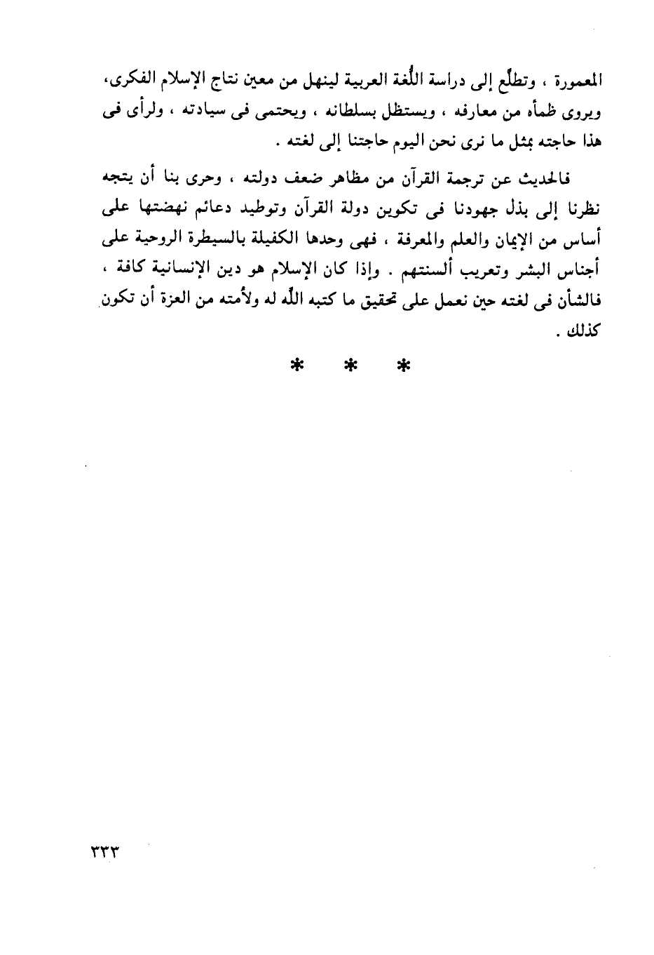 فالحديث عن ترجمة القرآن من مظاهر ضعف دولته، وحري بنا أن يتجه نظرنا إلى بذل جهودنا في تكوين دولة القرآن وتوطيد دعائم نهضتها على أساس من الإيمان والعلم والمعرفة، فهي وحدها الكفيلة بالسيطرة الروحية على أجناس البشر وتعريب ألسنتهم. وإذا كان الإسلام هو دين الإنسانية كافة، فالشأن في لغته حين نعمل على تحقيق ما كتبه الله له ولأمته من العزة أن تكون كذلك.
