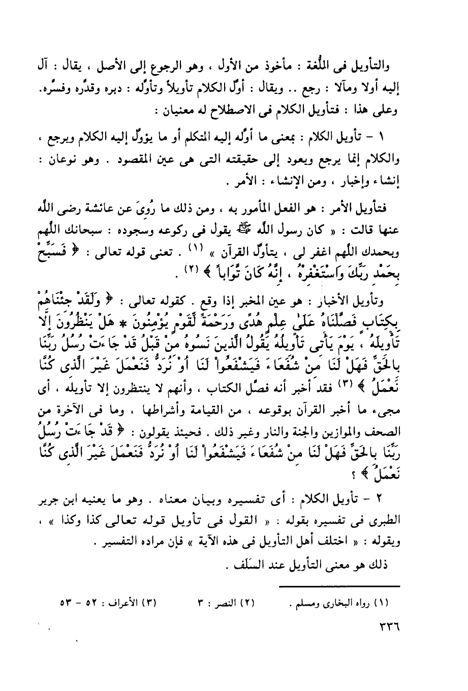وتأويل الأخبار: هو عين المخبر إذا وقع. كقوله تعالى: {وَلَقَدْ جِئْنَاهُمْ بِكِتَابٍ فَصَّلْنَاهُ عَلَى عِلْمٍ هُدىً وَرَحْمَةً لِقَوْمٍ يُؤْمِنُونَ، هَلْ يَنْظُرُونَ إِلَّا تَأْوِيلَهُ يَوْمَ يَأْتِي تَأْوِيلُهُ يَقُولُ الَّذِينَ نَسُوهُ مِنْ قَبْلُ قَدْ جَاءَتْ رُسُلُ رَبِّنَا بِالْحَقِّ فَهَلْ لَنَا مِنْ شُفَعَاءَ فَيَشْفَعُوا لَنَا أَوْ نُرَدُّ فَنَعْمَلَ غَيْرَ الَّذِي كُنَّا نَعْمَلُ} 3, فقد أخبر أنه فصَّل الكتاب، وأنهم لا ينتظرون إلا تأويله، أي مجيء ما أخبر القرآن بوقوعه من القيامة وأشراطها، وما في الآخرة من الصحف والموازين والجنة والنار وغير ذلك. فحينئذ يقولون: {قَدْ جَاءَتْ رُسُلُ رَبِّنَا بِالْحَقِّ فَهَلْ لَنَا مِنْ شُفَعَاءَ فَيَشْفَعُوا لَنَا أَوْ نُرَدُّ فَنَعْمَلَ غَيْرَ الَّذِي كُنَّا نَعْمَلُ} ؟