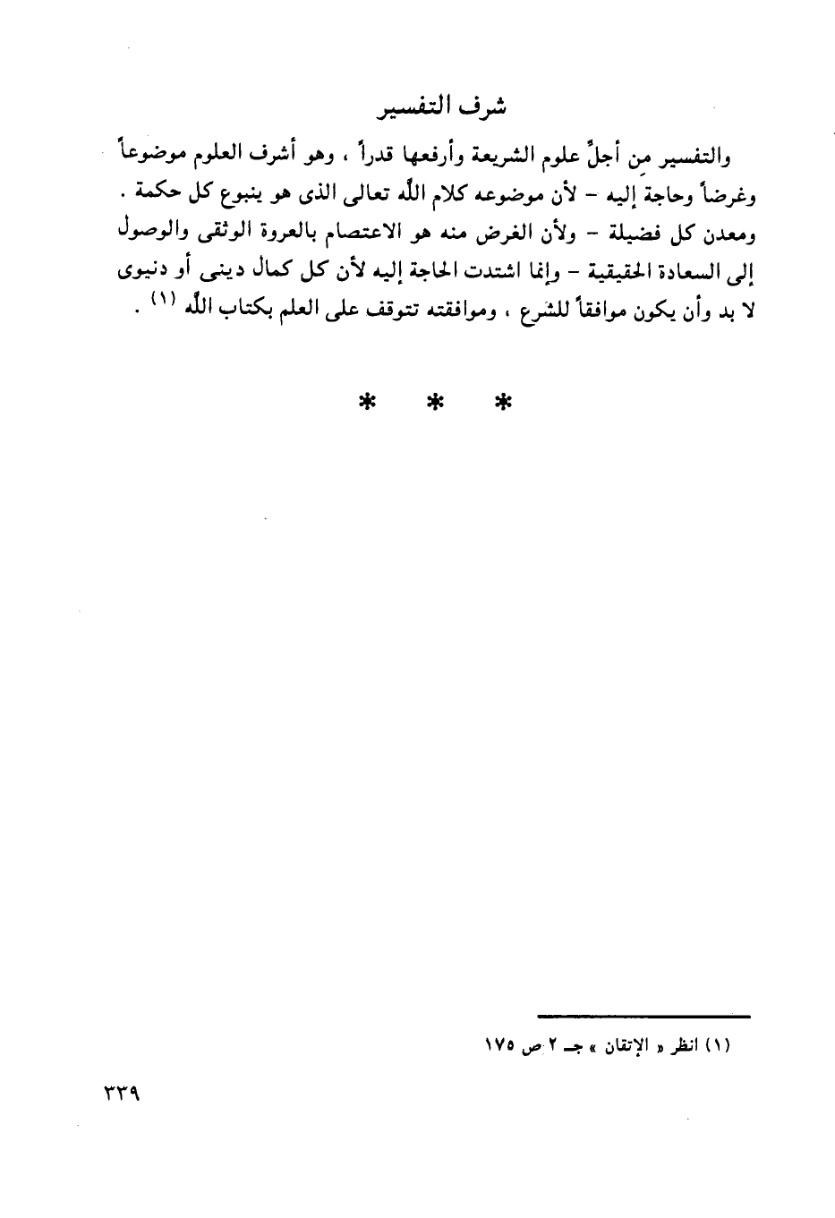 والتفسير من أجلِّ علوم الشريعة وأرفعها قدرًا، وهو أشرف العلوم موضوعًا وغرضًا وحاجة إليه لأن موضوعه كلام الله تعالى الذي هو ينبوع كل حكمة. ومعدن كل فضيلة ولأن الغرض منه هو الاعتصام بالعروة الوثقى والوصول إلى السعادة الحقيقية وإنما اشتدت الحاجة إليه؛ لأن كل كمال ديني أو دنيوي لا بد وأن يكون موافقًا للشرع، وموافقته على العلم بكتاب الله1.