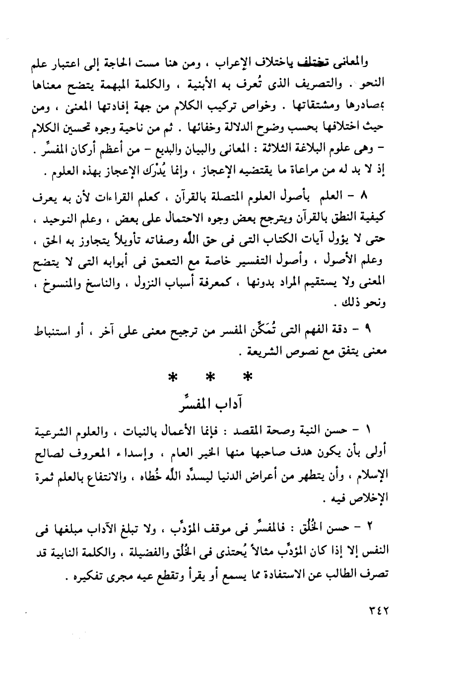 8- العلم بأصول العلوم المتصلة بالقرآن، كعلم القراءات؛ لأن به يعرف كيفية النطق بالقرآن ويترجح بعض وجوه الاحتمال على بعض، وعلم التوحيد، حتى لا يؤول آيات الكتاب التي في حق الله وصفاته تأويلًا يتجاوز به الحق، وعلم الأصول، وأصول التفسير خاصة مع التعمق في أبوابه التي لا يتضح المعنى ولا يستقيم المراد بدونها، كمعرفة أسباب النزول، والناسخ والمنسوخ، ونحو ذلك.