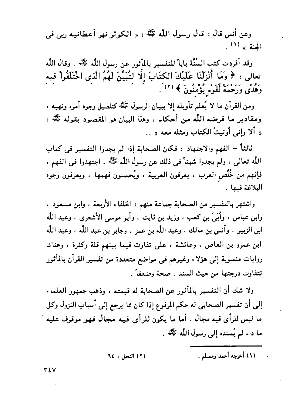 وقد أفردت كتب السٌّنَّة بابًا للتفسير بالمأثور عن رسول الله -صلى الله عليه وسلم- وقال الله تعالى: {وَمَا أَنْزَلْنَا عَلَيْكَ الْكِتَابَ إِلَّا لِتُبَيِّنَ لَهُمُ الَّذِي اخْتَلَفُوا فِيهِ وَهُدىً وَرَحْمَةً لِقَوْمٍ يُؤْمِنُونَ} 2.