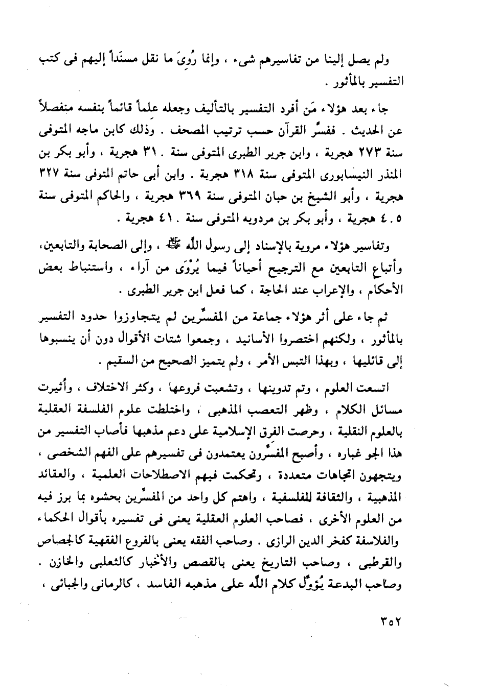 جاء بعد هؤلاء مَن أفرد التفسير بالتأليف وجعله علمًا قائمًا بنفسه منفصلًا عن الحديث. ففسر القرآن حسب ترتيب المصحف. وذلك كابن ماجه المتوفى سنة 273 هجرية، وابن جرير الطبري المتوفى سنة 310 هجرية، وأبو بكر بن المنذر النيسابوري المتوفى سنة 318 هجرية. وابن أبي حاتم المتوفى سنة 327 هجرية، وأبو الشيخ بن حبان المتوفى سنة 369 هجرية، والحاكم المتوفى سنة 405 هجرية، وأبو بكر بن مردويه المتوفى سنة 410 هجرية.