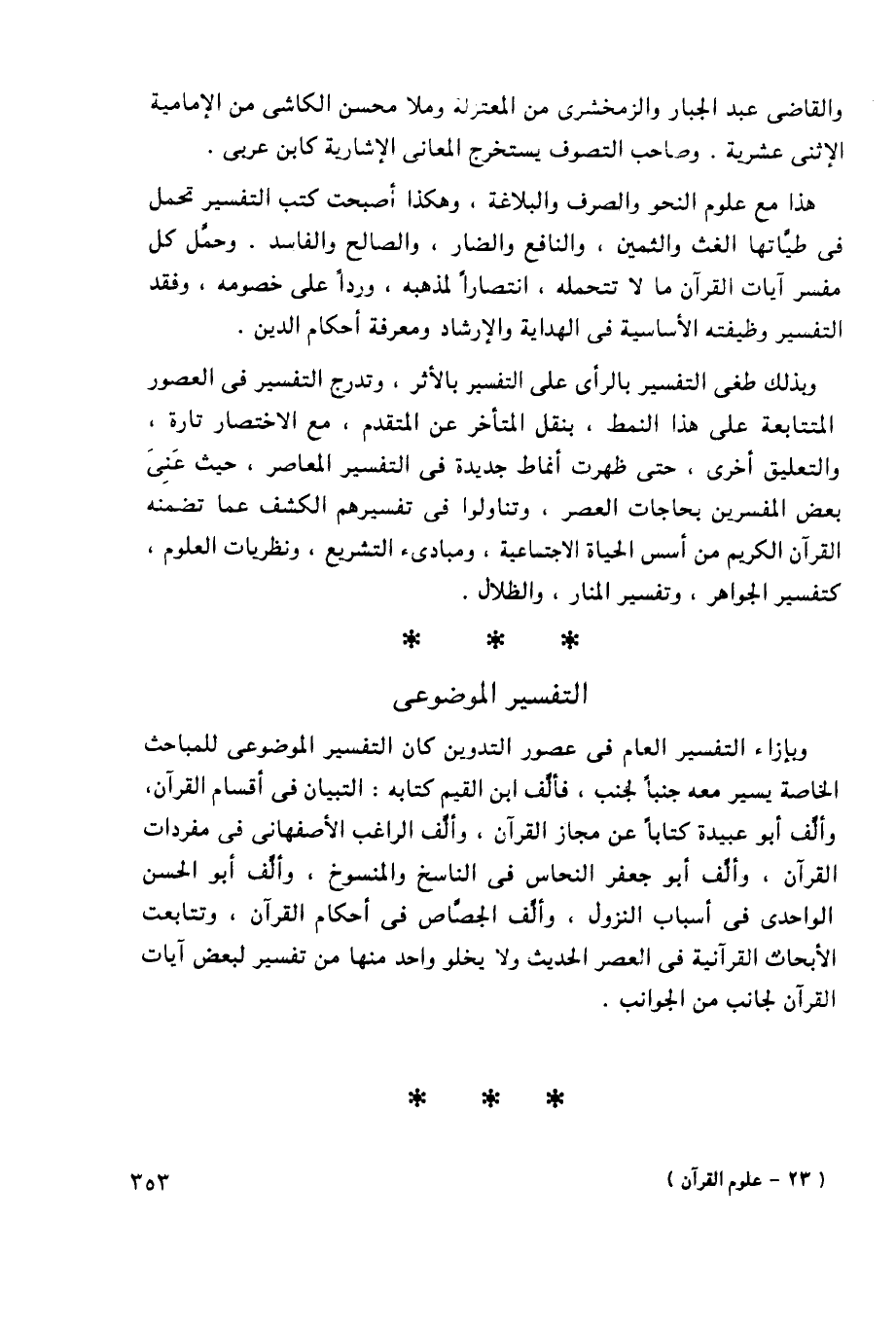 هذا مع علوم النحو والصرف والبلاغة، وهكذا أصبحت كتب التفسير تحمل في طياتها الغث والثمين، والنافع والضار، والصالح والفاسد. وحمَّل كل مفسر آيات القرآن ما لا تتحمله، انتصارًا لمذهبه، وردًّا على خصومه، وفقد التفسير وظيفته الأساسية في الهداية والإرشاد ومعرفة أحكام الدين.
