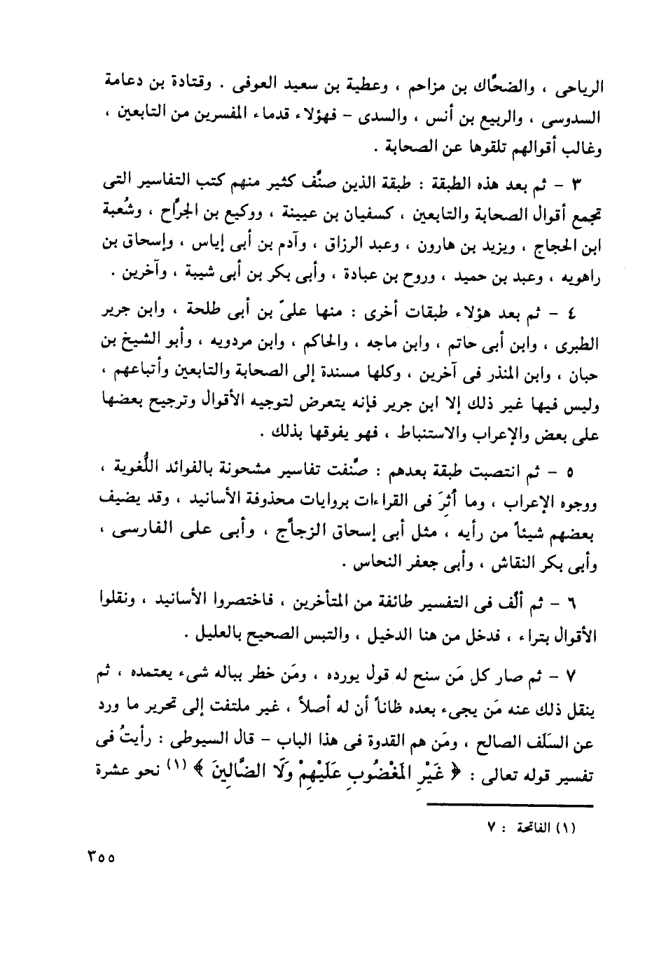 7- ثم صار كل مَن سنح له قول يورده، ومَن خطر بباله شيء يعتمده، ثم ينقل ذلك عنه مَن يجيء بعده ظانًّا أن له أصلًَا، غير ملتفت إلى تحرير ما ورد عن السلف الصالح، ومن هم القدوة في هذا الباب - قال السيوطي: رأيت في تفسير قوله تعالى: {غَيْرِ الْمَغْضُوبِ عَلَيْهِمْ وَلا الضَّالِّينَ} 1, نحو عشرة
