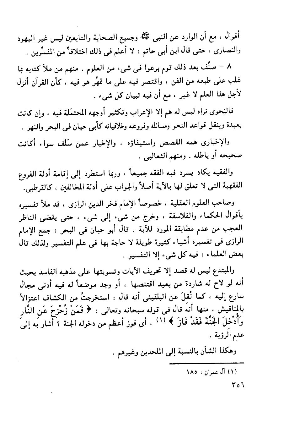 8- صنف بعد ذلك قوم برعوا في شيء من العلوم. منهم من ملأ كتابه بما غلب على طبعه من الفن، واقتصر فيه على ما تَمَهَّر هو فيه، كأن القرآن أنزل لأجل هذا العلم لا غير، مع أن فيه تبيان كل شيء.