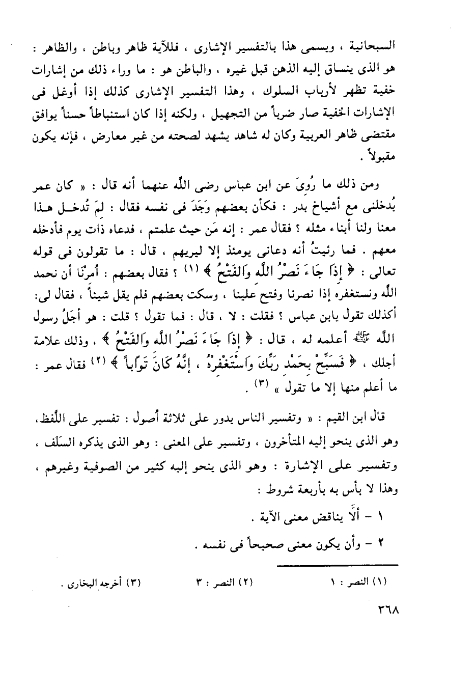 قال ابن القيم: "وتفسير الناس يدور على ثلاثة أصول: تفسير على اللفظ، وهو الذي ينحو إليه المتأخرون، وتفسير على المعنى: وهو الذي يذكره السلف، وتفسير على الإشارة: وهو الذي ينحو إليه كثير من الصوفية وغيرهم، وهذا لا بأس به بأربعة شروط: