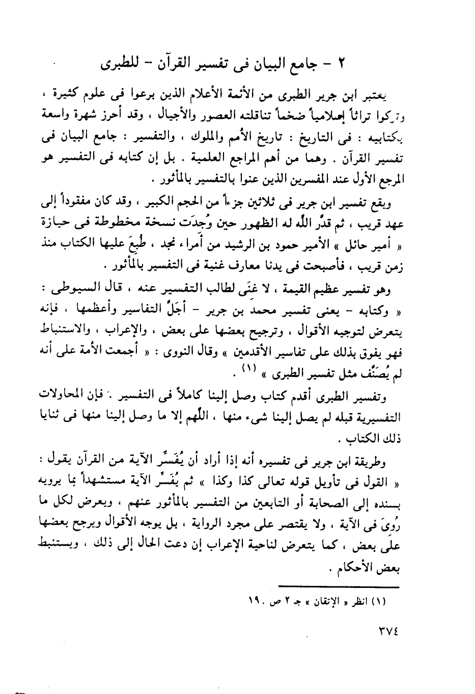 ويقع تفسير ابن جرير في ثلاثين جزءًا من الحجم الكبير، وقد كان مفقودًا إلى عهد قريب، ثم قدَّر الله له الظهور حين وُجِدت نسخة مخطوطة في حيازة "أمير حائل" الأمير حمود بن الرشيد من أمراء نجد، طُبِع عليها الكتاب منذ زمن قريب، فأصبحت في يدنا معارف غنية في التفسير بالمأثور.