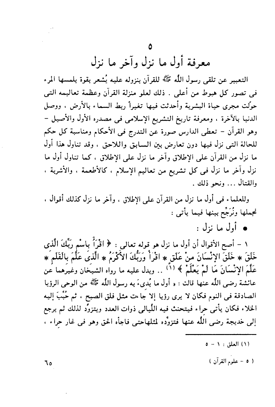 1- أصح الأقوال أن أول ما نزل هو قوله تعالى: {اقْرَأْ بِاسْمِ رَبِّكَ الَّذِي خَلَقَ، خَلَقَ الْأِنْسَانَ مِنْ عَلَقٍ، اقْرَأْ وَرَبُّكَ الْأَكْرَمُ، الَّذِي عَلَّمَ بِالْقَلَمِ، عَلَّمَ الْأِنْسَانَ مَا لَمْ يَعْلَمْ} 1, ويدل عليه ما رواه الشيخان وغيرهما عن عائشة رضي الله عنها قالت: "أول ما بُدِئَ به رسول الله -صلى الله عليه وسلم- من الوحي الرؤيا الصادقة في النوم, فكان لا يرى رؤيا إلا جاءت مثل فلق الصبح، ثم حُبِّبَ إليه الخلاء فكان يأتي حِراء فيتحنث فيه الليالي ذوات العدد، ويتزود لذلك ثم يرجع إلى خديجة رضي الله عنها فتزوده لمثلها حتى فاجأه الحق وهو في غار حِراء،