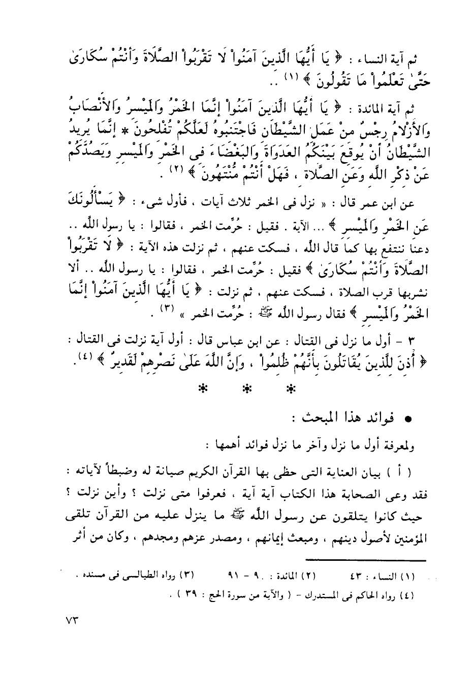 عن ابن عمر قال: "نزل في الخمر ثلاث آيات، فأول شيء: {يَسْأَلونَكَ عَنِ الْخَمْرِ وَالْمَيْسِرِ} ... الآية. فقيل: "حُرِّمت الخمر"، فقالوا: يا رسول الله.. دعنا ننتفع بها كما قال الله، فسكت عنهم، ثم نزلت هذه الآية: {يَا أَيُّهَا الَّذِينَ آمَنُوا لا تَقْرَبُوا الصَّلاةَ وَأَنْتُمْ سُكَارَى} فقيل: "حُرِّمت الخمر"، فقالوا: يا رسول الله.. ألا نشربها قرب الصلاة، فسكت عنهم، ثم نزلت: {يَا أَيُّهَا الَّذِينَ آمَنُوا إِنَّمَا الْخَمْرُ وَالْمَيْسِرُ} فقال رسول الله -صلى الله عليه وسلم: "حُرِّمت الخمر" 3.