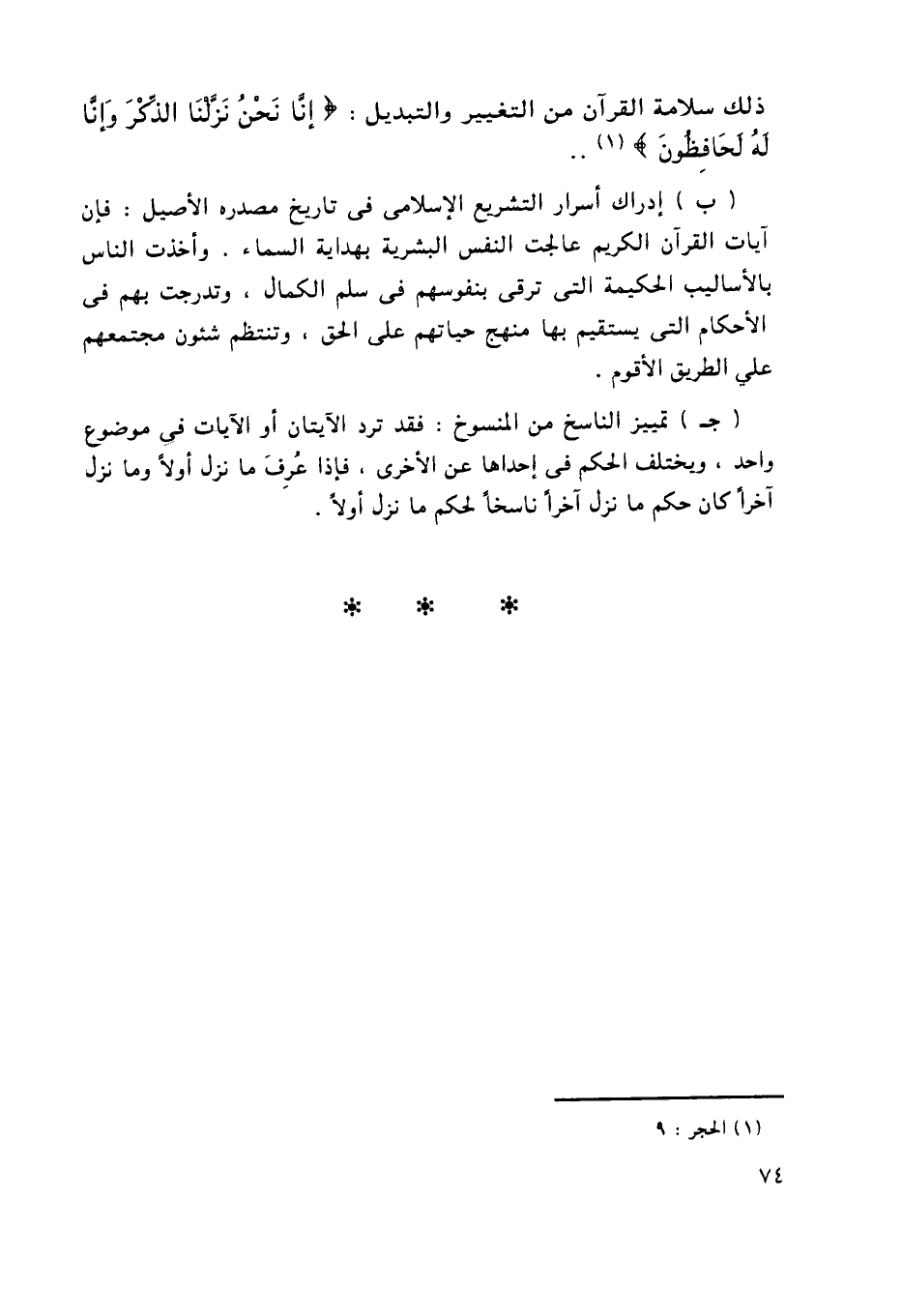 ب- إدراك أسرار التشريع الإسلامي في تاريخ مصدره الأصيل: فإن آيات القرآن الكريم عالجت النفس البشرية بهداية السماء. وأخذت الناس بالأساليب الحكيمة التي ترقى بنفوسهم في سلم الكمال، وتدرجت بهم في الأحكام التي يستقيم بها منهج حياتهم على الحق، وتنتظم شئون مجتمعهم على الطريق الأقوم.