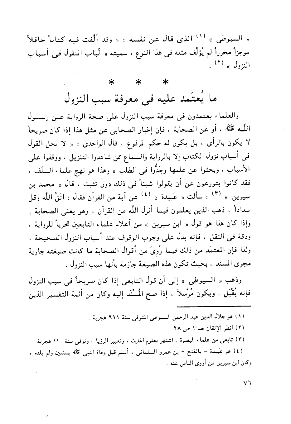 والعلماء يعتمدون في معرفة سبب النزول على صحة الرواية عن رسول الله -صلى الله عليه وسلم- أو عن الصحابة، فإن إخبار الصحابي عن مثل هذا إذا كان صريحًا لا يكون بالرأي، بل يكون له حكم المرفوع، قال الواحدي: "لا يحل القول في أسباب نزول الكتاب إلا بالرواية والسماع ممن شاهدوا التنزيل، ووقفوا على الأسباب، وبحثوا عن علمها وجدُّوا في الطلب" وهذا هو نهج علماء السَّلف، فقد كانوا يتورعون عن أن يقولوا شيئًا في ذلك دون تثبت، قال "محمد بن سيرين"1: سألت "عبيدة"2 عن آية من القرآن فقال: اتق الله وقل سدادًا، ذهب الذين يعلمون فيما أنزل الله من القرآن، وهو يعني الصحابة، وإذا كان هذا هو قول "ابن سيرين" من أعلام علماء التابعين تحريًّا للرواية، ودقة في النقل، فإنه يدل على وجوب الوقوف عند أسباب النزول الصحيحة، ولذا فإن المعتمد من ذلك فيما رُوِي من أقوال الصحابة ما كانت صيغته جارية مجرى المسند، بحيث تكون هذه الصيغة جازمة بأنها سبب النزول.