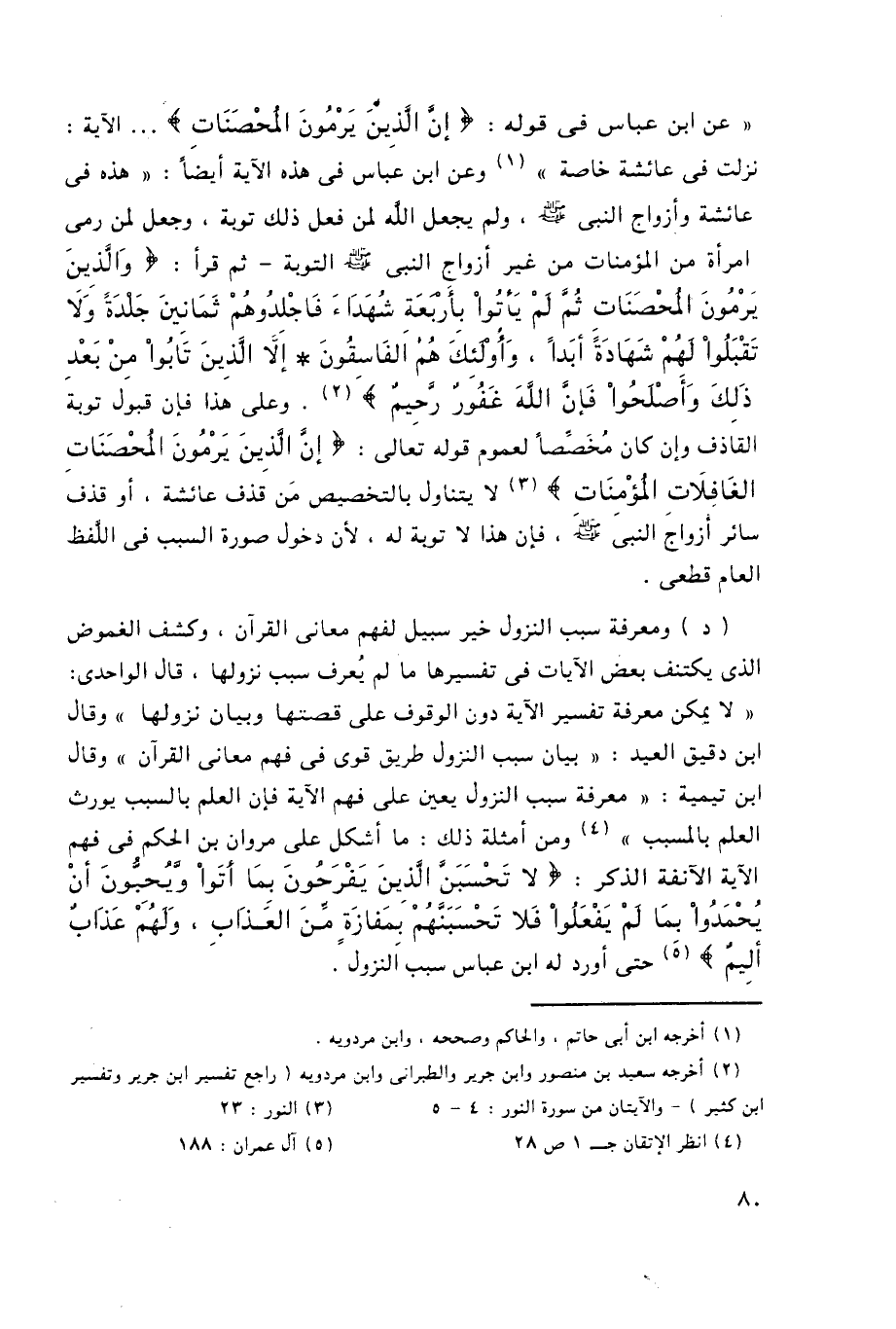 "عن ابن عباس في قوله: {إِنَّ الَّذِينَ يَرْمُونَ الْمُحْصَنَاتِ} ... الآية: نزلت في عائشة خاصة"1, وعن ابن عباس في هذه الآية أيضًا: "هذه في عائشة وأزواج النبي -صلى الله عليه وسلم- ولم يجعل الله لمن فعل ذلك توبة، وجعل لمن رمى امرأة من المؤمنات من غير أزواج النبي -صلى الله عليه وسلم- التوبة, ثم قرأ: {وَالَّذِينَ يَرْمُونَ الْمُحْصَنَاتِ ثُمَّ لَمْ يَأْتُوا بِأَرْبَعَةِ شُهَدَاءَ فَاجْلِدُوهُمْ ثَمَانِينَ جَلْدَةً وَلا تَقْبَلُوا لَهُمْ شَهَادَةً أَبَداً وَأُولَئِكَ هُمُ الْفَاسِقُونَ, إِلَّا الَّذِينَ تَابُوا مِنْ بَعْدِ ذَلِكَ وَأَصْلَحُوا فَإِنَّ اللَّهَ غَفُورٌ رَحِيمٌ} 2. وعلى هذا فإن قبول توبة القاذف وإن كان مخُصَصًّا لعموم قوله تعالى: {إِنَّ الَّذِينَ يَرْمُونَ الْمُحْصَنَاتِ الْغَافِلاتِ} 3, لا يتناول بالتخصيص مَن قذف عائشة، أو قذف سائر أزواج النبي -صلى الله عليه وسلم- فإن هذا لا توبة له، لأن دخول صورة السبب في اللفظ العام قطعي.