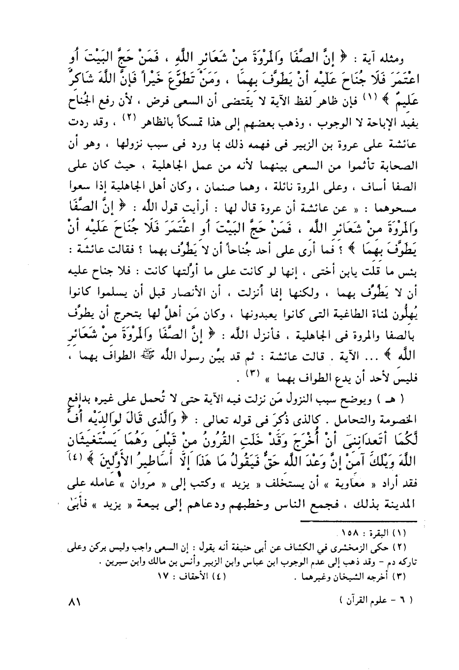 ومثله آية: {إِنَّ الصَّفَا وَالْمَرْوَةَ مِنْ شَعَائِرِ اللَّهِ فَمَنْ حَجَّ الْبَيْتَ أَوِ اعْتَمَرَ فَلا جُنَاحَ عَلَيْهِ أَنْ يَطَّوَّفَ بِهِمَا وَمَنْ تَطَوَّعَ خَيْرًا فَإِنَّ اللَّهَ شَاكِرٌ عَلِيمٌ} 1, فإن ظاهر لفظ الآية لا يقتضي أن السعي فرض، لأن رفع الجُناح يفيد الإباحة لا الوجوب، وذهب بعضهم إلى هذا تمسكًا بالظاهر2، وقد ردت عائشة على عروة بن الزبير في فهمه ذلك بما ورد في سبب نزولها، وهو أن الصحابة تأثموا من السعي بينهما لأنه من عمل الجاهلية، حيث كان على الصفا أساف، وعلى المروة نائلة، وهما صنمان، وكان أهل الجاهلية إذا سعوا مسحوهما: "عن عائشة أن عروة قال لها: أرأيت قول الله: {إِنَّ الصَّفَا وَالْمَرْوَةَ مِنْ شَعَائِرِ اللَّهِ فَمَنْ حَجَّ الْبَيْتَ أَوِ اعْتَمَرَ فَلا جُنَاحَ عَلَيْهِ أَنْ يَطَّوَّفَ بِهِمَا} فما أرى على أحد جُناحًا أن لا يطوف بهما؟ فقالت عائشة: بئس ما قلت يابن أختي، إنها لو كانت على ما أوَّلتها كانت: فلا جناح عليه أن لا يطوف بهما، ولكنها إنما أنزلت، أن الأنصار قبل أن يسلموا كانوا يُهلُّون لمناة الطاغية التي كانوا يعبدونها، وكان من أهلَّ لها يتحرج أن يطوف بالصفا والمروة في الجاهلية، فأنزل الله: {إِنَّ الصَّفَا وَالْمَرْوَةَ مِنْ شَعَائِرِ اللَّهِ} ... الآية. قالت عائشة: ثم قد بيَّن رسول الله -صلى الله عليه وسلم- الطواف بهما، فليس لأحد أن يدع الطواف بهما"3.
