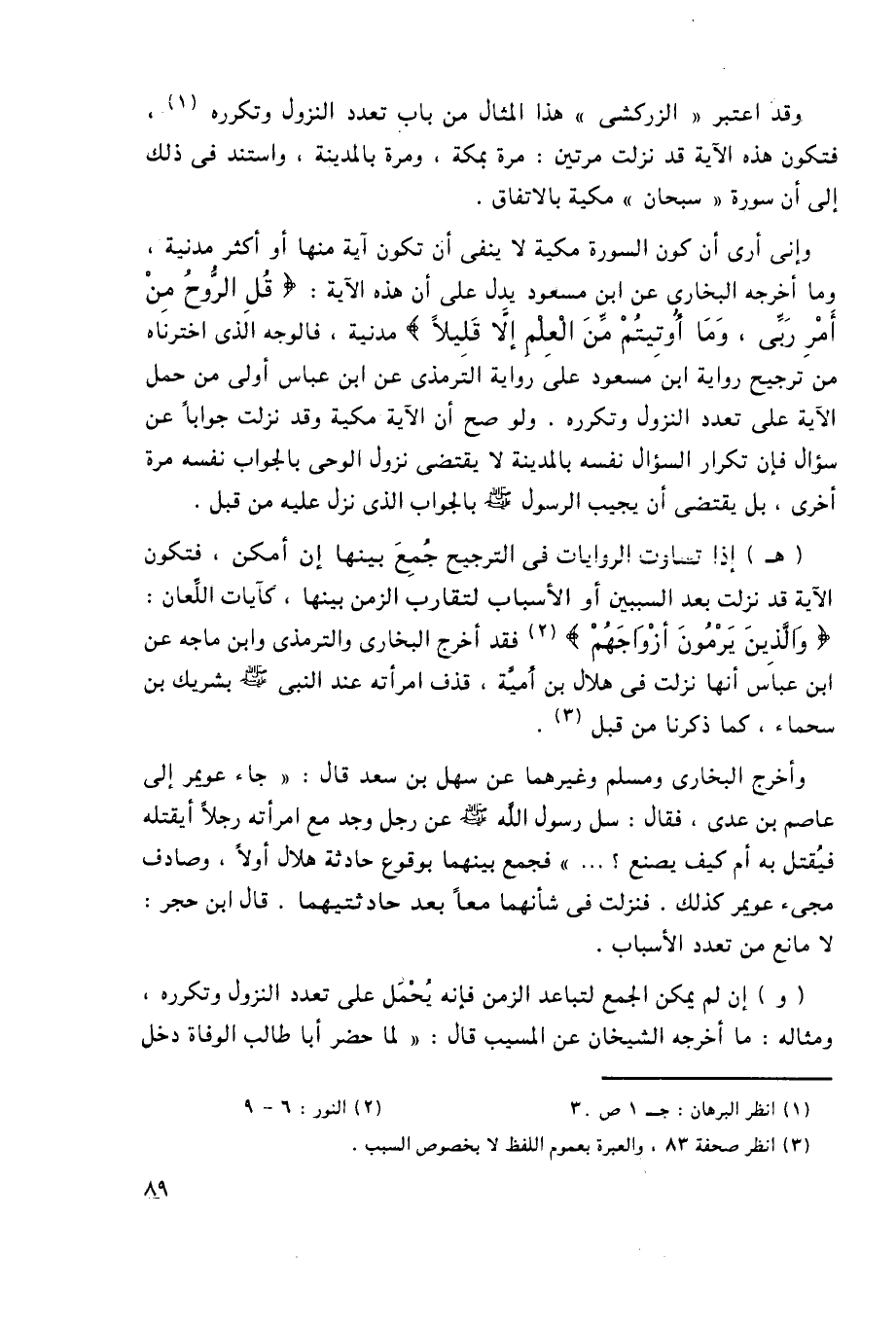 وقد اعتبر "الزركشي" هذا المثال من باب تعدد النزول وتكرره1، فتكون هذه الآية قد نزلت مرتين: مرة بمكة، ومرة بالمدينة، واستند في ذلك إلى أن سورة "سبحان" مكية بالاتفاق.