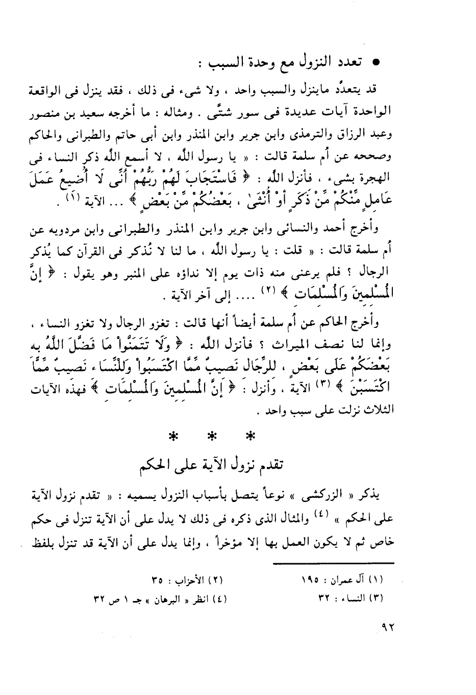 قد يتعدد ما ينزل والسبب واحد، ولا شيء في ذلك، فقد ينزل في الواقعة الواحدة آيات عديدة في سور شتى. ومثاله: ما أخرجه سعيد بن منصور وعبد الرزاق والترمذي وابن جرير وابن المنذر وابن أبي حاتم والطبراني والحاكم وصححه عن أم سلمة قالت: "يا رسول الله، لا أسمع الله ذكر النساء في الهجرة بشيء، فأنزل الله: {فَاسْتَجَابَ لَهُمْ رَبُّهُمْ أَنِّي لا أُضِيعُ عَمَلَ عَامِلٍ مِنْكُمْ مِنْ ذَكَرٍ أَوْ أُنْثَى بَعْضُكُمْ مِنْ بَعْضٍ} ... الآية1.