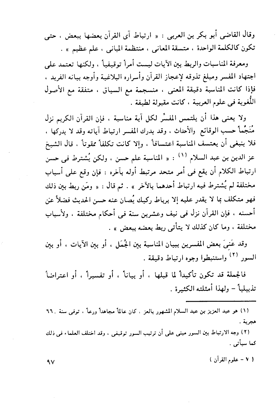 وقال القاضي أبو بكر بن العربي: "ارتباط آي القرآن بعضها ببعض، حتى تكون كالكلمة الواحدة، متسقة المعاني، منتظمة المباني، علم عظيم".