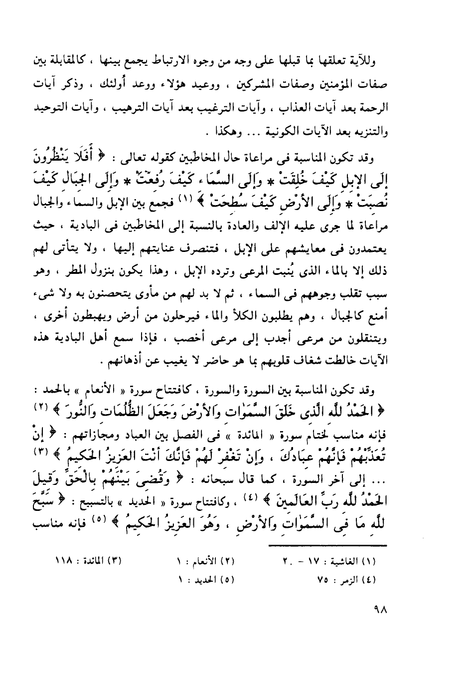 وقد تكون المناسبة بين السورة والسورة، كافتتاح سورة "الأنعام" بالحمد: {الْحَمْدُ لِلَّهِ الَّذِي خَلَقَ السَّمَاوَاتِ وَالْأَرْضَ وَجَعَلَ الظُّلُمَاتِ وَالنُّورَ} 2, فإنه مناسب لختام سورة "المائدة" في الفصل بين العباد ومجازاتهم: {إِنْ تُعَذِّبْهُمْ فَإِنَّهُمْ عِبَادُكَ وَإِنْ تَغْفِرْ لَهُمْ فَإِنَّكَ أَنْتَ الْعَزِيزُ الْحَكِيمُ} 3.. إلى آخر السورة، كما قال سبحانه: {وَقُضِيَ بَيْنَهُمْ بِالْحَقِّ وَقِيلَ الْحَمْدُ لِلَّهِ رَبِّ الْعَالَمِينَ} 4، وكافتتاح سورة "الحديد" بالتسبيح: {سَبَّحَ لِلَّهِ مَا فِي السَّمَاوَاتِ وَالْأَرْضِ وَهُوَ الْعَزِيزُ الْحَكِيمُ} 5, فإنه مناسب