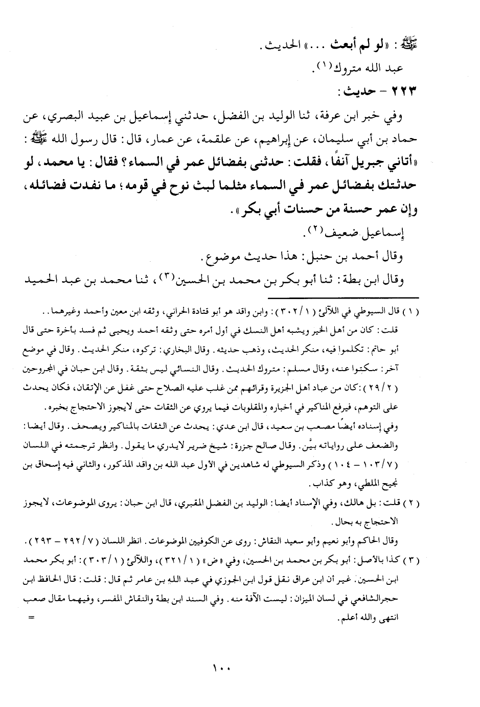 223 - حَدِيث: وَفِي خبر ابْن عَرَفَة، ثَنَا الْوَلِيد بن الْفضل، حَدثنِي إِسْمَاعِيل بن عبيد الْبَصْرِيّ، عَن حَمَّاد بن أبي سُلَيْمَان، عَن إِبْرَاهِيم، عَن عَلْقَمَة، عَن عمار، قَالَ: قَالَ رَسُول الله صلى الله عَلَيْهِ وَسلم: أَتَانِي جِبْرِيل آنِفا، فَقلت: حَدثنِي بفضائل عمر فِي السَّمَاء؟ فَقَالَ: يَا مُحَمَّد، لَو حدثتك بفضائل عمر فِي السَّمَاء مثلهَا لبث نوح قومه؛ مَا نفذت فضائله، وَإِن عمر حَسَنَة من حَسَنَات أبي بكر ". إِسْمَاعِيل ضَعِيف. وَقَالَ أَحْمد بن حَنْبَل: هَذَا حَدِيث مَوْضُوع. وَقَالَ ابْن بطة: ثَنَا أَبُو بكر بن مُحَمَّد بن الْحُسَيْن، ثَنَا مُحَمَّد بن عبد الحميد