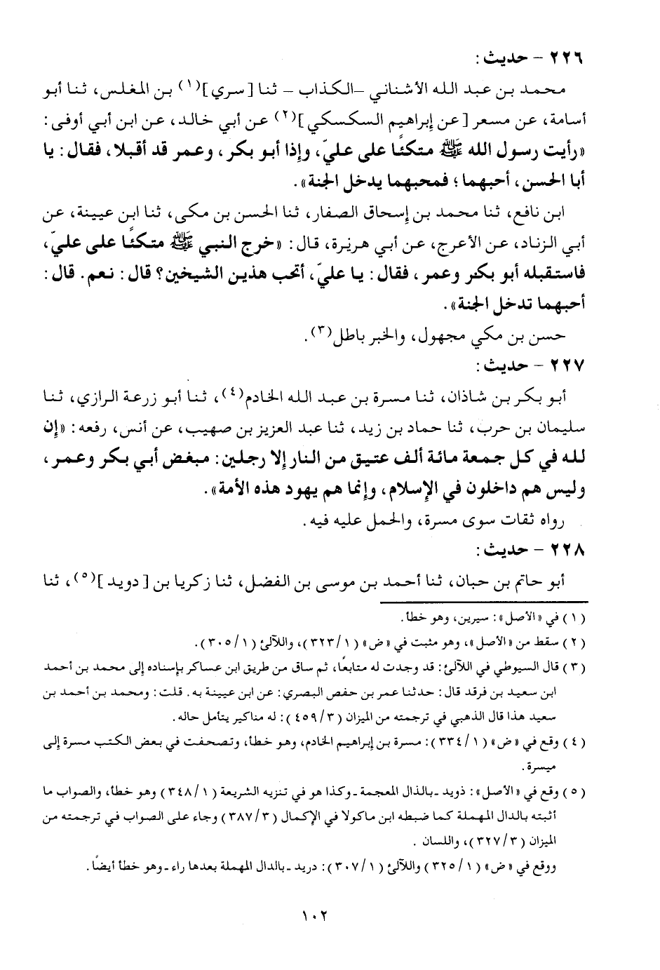 226 - حَدِيث: مُحَمَّد بن عبد الله الْأُشْنَانِي - الْكذَّاب - ثَنَا [سري] بن الْمُغلس، ثَنَا أَبُو أُسَامَة، عَن مسعر [عَن إِبْرَاهِيم السكْسكِي] عَن أبي خَالِد، عَن ابْن أبي أوفى: " رَأَيْت رَسُول الله صلى الله عَلَيْهِ وَسلم مُتكئا على عَليّ، وَإِذا أَبُو بكر، وَعمر قد أَقبلَا، فَقَالَ: يَا أَبَا الْحسن، أحبهما؛ فمحبهما يدْخل الْجنَّة ". ابْن نَافِع، ثَنَا مُحَمَّد بن إِسْحَاق الصفار، ثَنَا الْحسن بن مكى، ثَنَا ابْن عُيَيْنَة، عَن أبي الزِّنَاد، عَن الْأَعْرَج، عَن أبي هُرَيْرَة، قَالَ: " خرج النَّبِي صلى الله عَلَيْهِ وَسلم مُتكئا على عَليّ، فَاسْتَقْبلهُ أَبُو بكر وَعمر، فَقَالَ: يَا عَليّ، أَتُحِبُّ هذَيْن الشَّيْخَيْنِ؟ قَالَ: نعم. قَالَ: أحبهما تدخل الْجنَّة ". حسن ين مكي مَجْهُول، وَالْخَبَر بَاطِل.