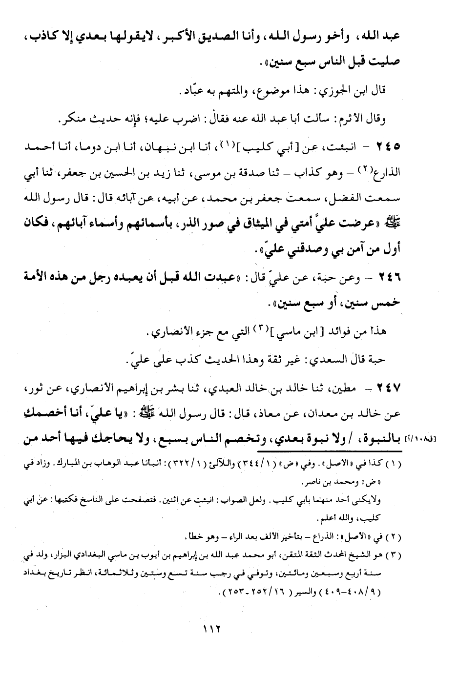 246 -: وَعَن حَبَّة، عَن عَليّ قَالَ: " عبدت الله قبل أَن يعبده رجل من هَذَا الْأمة خمس سِنِين، أَو سبع سِنِين ". هَذَا من فَوَائِد [ابْن ماسي] الَّتِي مَعَ جُزْء الْأنْصَارِيّ. حَبَّة قَالَ السَّعْدِيّ: غير ثِقَة وَهَذَا الحَدِيث كذب على عَليّ.