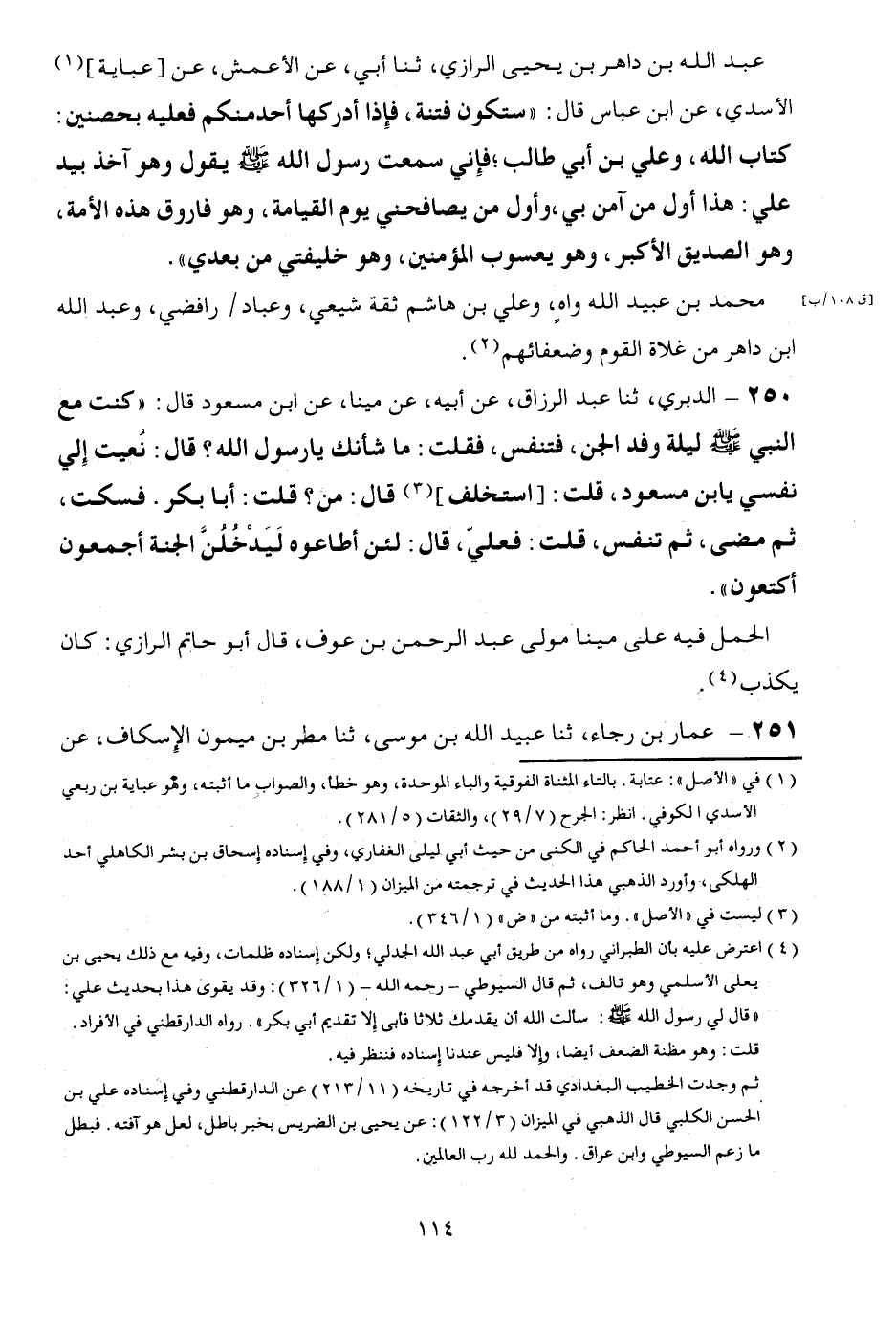 250 -: الدبرِي، ثَنَا عبد الرَّزَّاق، عَن أَبِيه، عَن مينا، عَن ابْن مَسْعُود قَالَ: " كنت مَعَ النَّبِي صلى الله عَلَيْهِ وَسلم لَيْلَة وَفد الْجِنّ، فتنفس، فَقلت: مَا شَأْنك يَا رَسُول الله؟ قَالَ: نعيت إِلَيّ نَفسِي يَا بن مَسْعُود، قلت: [اسْتخْلف] قَالَ: من؟ قلت: أَبَا بكر. فَسكت، ثمَّ مضى، ثمَّ تنفس، قلت: فعلي، قَالَ: لَئِن أطاعوه ليدخلن الْجنَّة أَجْمَعُونَ أكتعون ". الْحمل فِي على مينا مولى عبد الرَّحْمَن بن عَوْف، قَالَ أَبُو حَاتِم الرَّازِيّ: كَانَ يكذب.