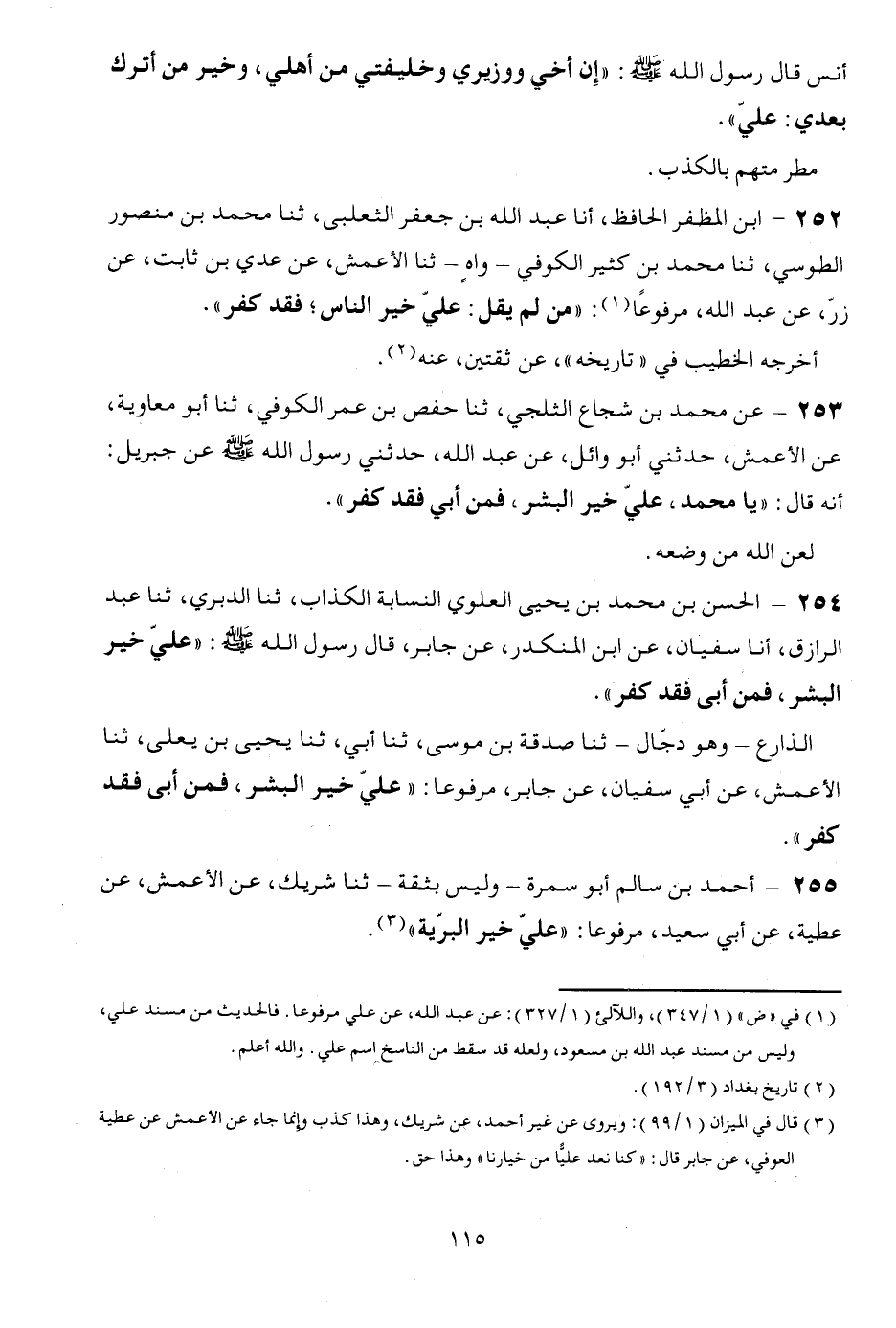 252 -: ابْن المظفر الْحَافِظ، أَنا عبد الله بن جَعْفَر الثعلبى، ثَنَا مُحَمَّد بن مَنْصُور الطوسي، ثَنَا مُحَمَّد بن كثير الْكُوفِي - واهٍ - ثَنَا الْأَعْمَش، عَن عدي بن ثَابت، عَن زر، عَن عبد الله، مَرْفُوعا: " من لم يقل: عَليّ خير النَّاس؛ فقد كفر ". أخرجه الْخَطِيب فِي " تَارِيخه "، عَن ثقتين، عَنهُ.