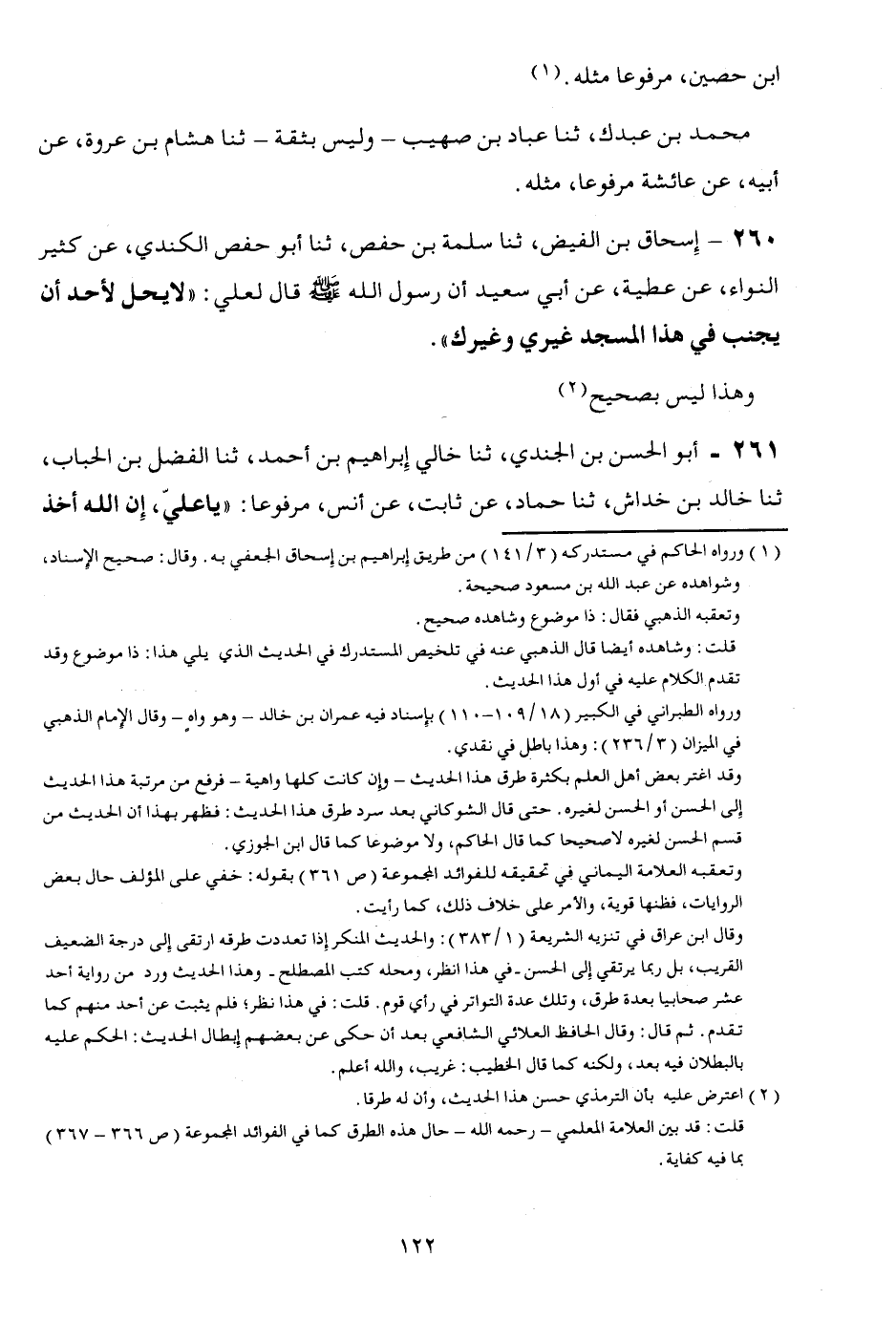 260 - إِسْحَاق بن الْفَيْض، ثَنَا سَلمَة بن حَفْص، ثَنَا أَبُو حَفْص الْكِنْدِيّ، عَن كثير النواء، عَن عَطِيَّة، عَن أبي سعيد أَن رَسُول الله صلى الله عَلَيْهِ وَسلم قَالَ لعَلي: " لَا يحل لأحد أَن يجنب فِي هَذَا الْمَسْجِد غَيْرِي وَغَيْرك ". وَهَذَا لَيْسَ بِصَحِيح.