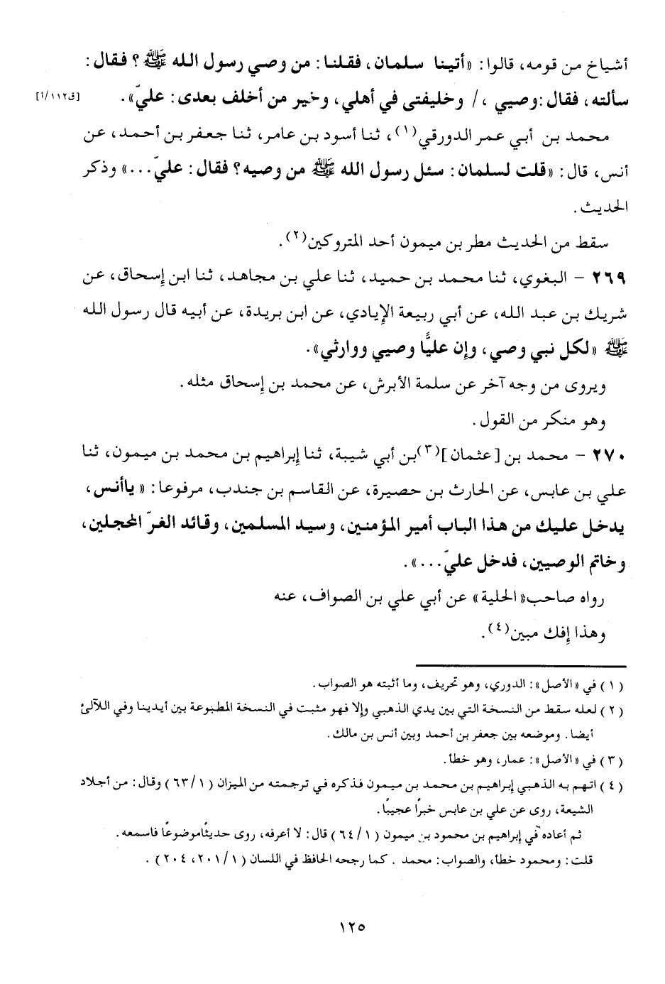270 - مُحَمَّد بن [عُثْمَان] بن أبي شيبَة، ثَنَا إِبْرَاهِيم بن مُحَمَّد بن مَيْمُون، ثَنَا عَليّ بن عَبَّاس، عَن الْحَارِث بن حصيرة، عَن الْقَاسِم بن جُنْدُب، مَرْفُوعا: " يَا أنس، يدْخل عَلَيْك من هَذَا الْبَاب أَمِير الْمُؤمنِينَ، وَسيد الْمُسلمين، وقائد الغر المحجلين، وَخَاتم الْوَصِيّين، فَدخل عَليّ ... ". رَوَاهُ صَاحب " الْحِلْية " عَن أبي عَليّ بن الصَّواف، عَنهُ وَهَذَا إفْك مُبين.