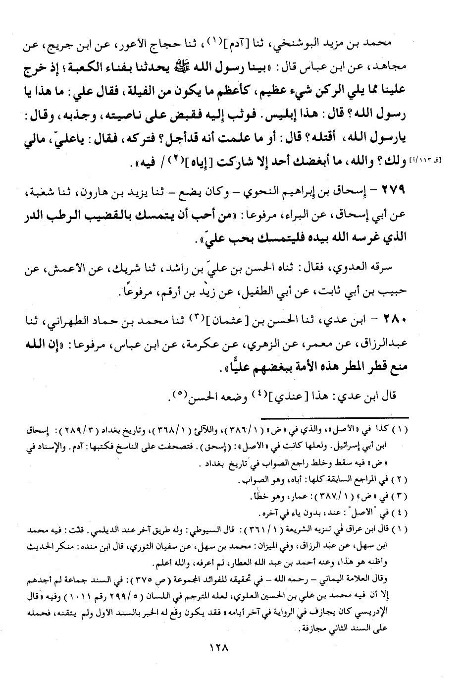 279 - إِسْحَاق بن إِبْرَاهِيم النَّحْوِيّ - وَكَانَ يضع - ثَنَا يزِيد بن هَارُون، ثَنَا شُعْبَة، عَن أبي إِسْحَاق، عَن الْبَراء، مَرْفُوعا: " من أحب أَن يتَمَسَّك بالقضيب الرطب الدّرّ الَّذِي غرسه الله بِيَدِهِ فليتمسك بحب عَليّ ". سَرقه الْعَدوي، فَقَالَ: ثناه الْحسن بن عَليّ بن رَاشد، ثَنَا شريك، عَن الْأَعْمَش، عَن حبيب بن أبي ثَابت، عَن أ [ي الطُّفَيْل، عَن زيد بن أَرقم، مَرْفُوعا.