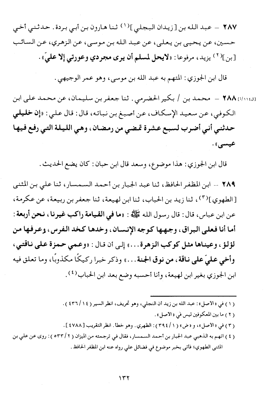 289 - ابْن المظفر الْحَافِظ، ثَنَا عبد الْجَبَّار بن أَحْمد السمسار، ثَنَا عَليّ بن الْمثنى [الطهوي] ، ثَنَا زيد بن الْحباب، ثَنَا ابْن لَهِيعَة، ثَنَا جَعْفَر بن ربيعَة، عَن عِكْرِمَة، عَن ابْن عَبَّاس، قَالَ: قَالَ رَسُول الله صلى الله عَلَيْهِ وَسلم: " مَا فِي الْقِيَامَة رَاكب غَيرنَا، نَحن أَرْبَعَة: أما أَنا فعى الْبراق، وَجههَا كوجه الْإِنْسَان، وخدها كخد الْفرس، وَعرفهَا من لُؤْلُؤ، وعيناها مثل كَوْكَب الزهرة ... " إِلَى أَن قَالَ: " وَعمي حَمْزَة على نَاقَتي، وَأخي عَليّ على نَاقَة، من نُوق الْجنَّة ... " وَذكر خَبرا ركيكاً مكذوباً، وَمَا تعلق فِيهِ ابْن الْجَوْزِيّ بِغَيْر ابْن لَهِيعَة، وَأَنا أَحْسبهُ وضع بعد ابْن الْحباب.