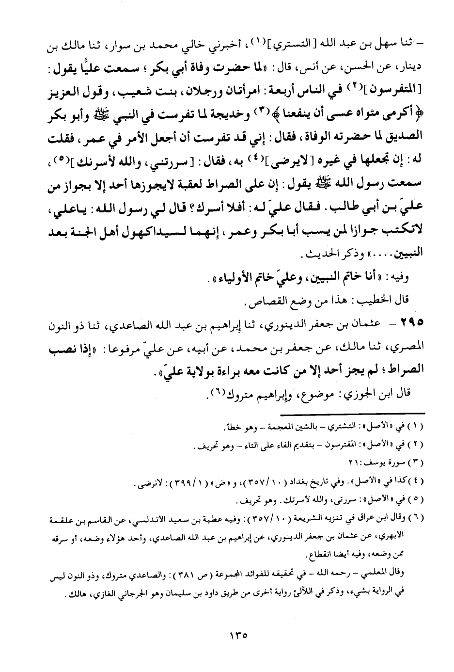 295 - عُثْمَان بن جَعْفَر الدينَوَرِي، ثَنَا إِبْرَاهِيم بن عبد الله الصاعدي، ثَنَا ذُو النُّون الْمصْرِيّ، ثَنَا مَالك، عَن جَعْفَر بن مُحَمَّد، عَن أَبِيه، عَن عَليّ مَرْفُوعا: " إِذا نصب الصِّرَاط؛ لم يجز أحد إِلَّا من كَانَت مَعَه بَرَاءَة بِولَايَة عَليّ ". قَالَ ابْن الْجَوْزِيّ: مَوْضُوع، وَإِبْرَاهِيم مَتْرُوك.