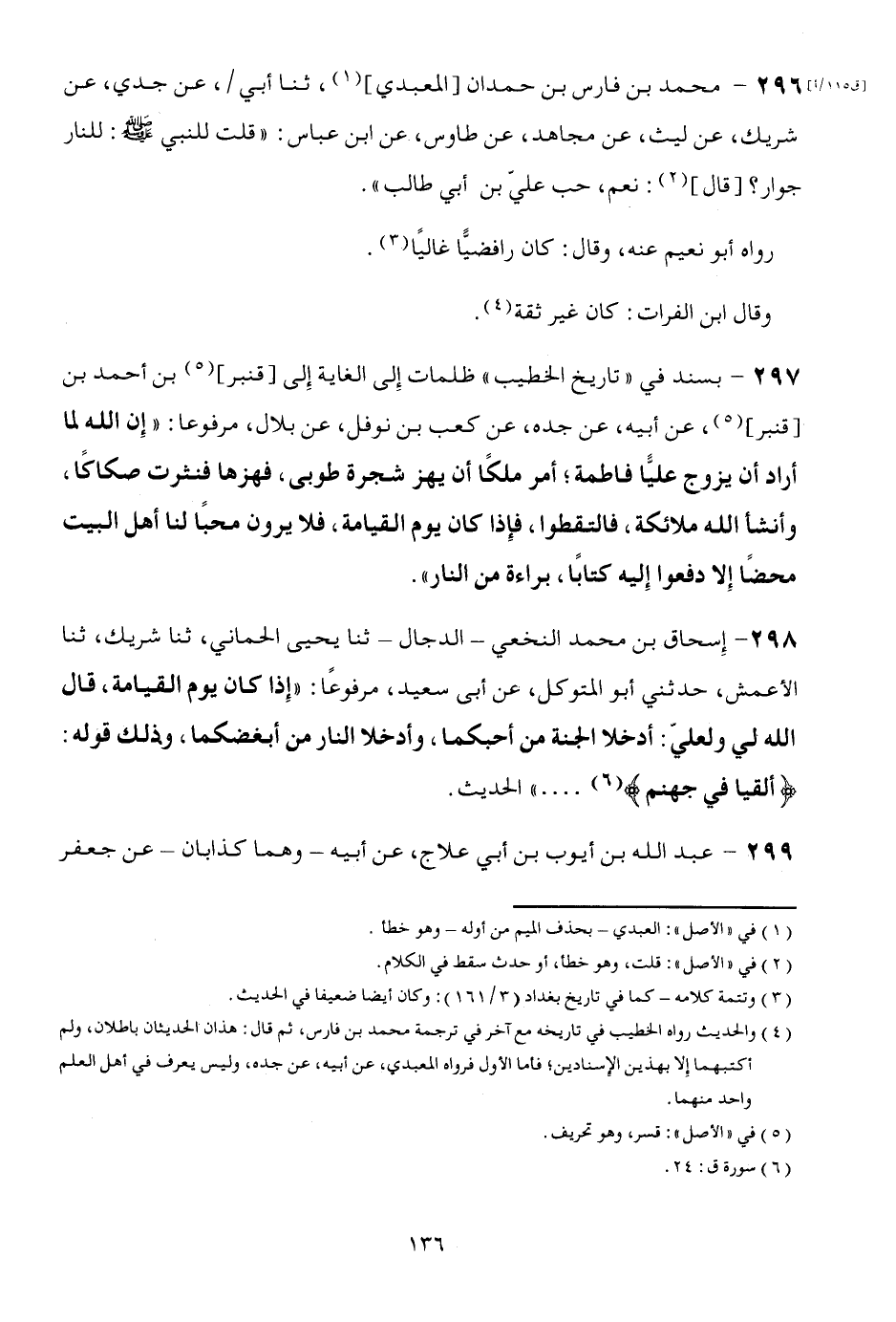 296 - مُحَمَّد بن فَارس بن حمدَان [المعبدي] ، ثَنَا أبي /، عَن جدي، عَن شريك، عَن لَيْث، عَن مُجَاهِد، عَن طَاوس، عَن ابْن عَبَّاس: " قلت للنَّبِي صلى الله عَلَيْهِ وَسلم: للنار جوَار؟ [قَالَ] : نعم، حب عَليّ بن أبي طَالب ". رَوَاهُ أَبُو نعيم عَنهُ، وَقَالَ: كَانَ رَافِضِيًّا غالياً. وَقَالَ ابْن الْفُرَات: كَانَ غير ثِقَة.