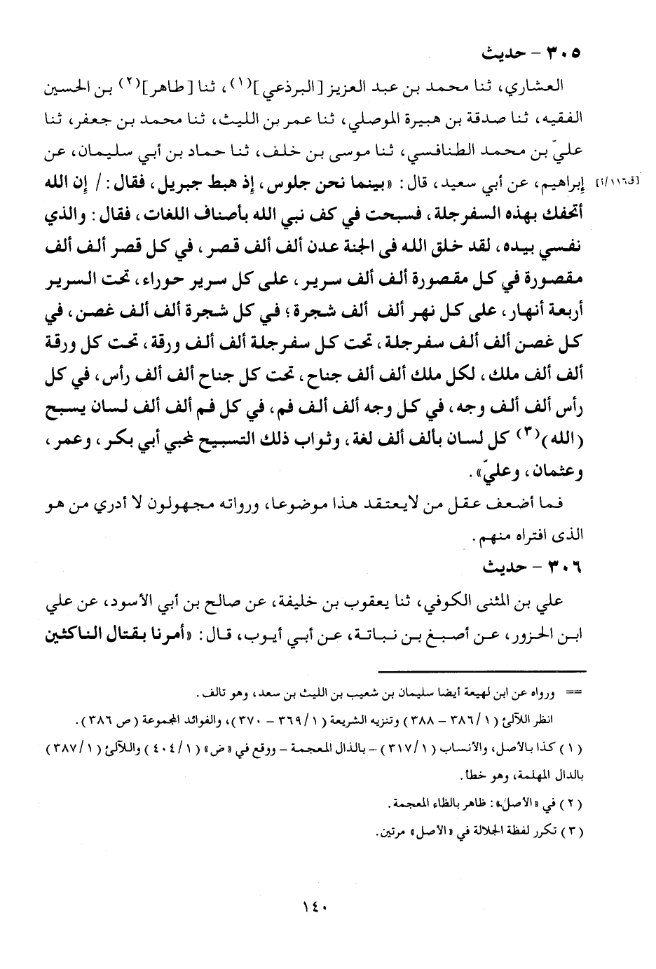 305 - حَدِيث العشاري، ثَنَا مُحَمَّد بن عبد الْعَزِيز [البرذعي] ، ثَنَا [طَاهِر] بن الْحُسَيْن الْفَقِيه، ثَنَا صَدَقَة بن هُبَيْرَة الْموصِلِي، ثَنَا عمر بن اللَّيْث، ثَنَا مُحَمَّد بن جَعْفَر، ثَنَا عَليّ بن مُحَمَّد الطنافسي، ثَنَا مُوسَى بن خلف، ثَنَا حَمَّاد بن أبي سُلَيْمَان، عَن إِبْرَاهِيم، عَن أبي سعيد، قَالَ: " بَيْنَمَا نَحن جُلُوس، إِذا هَبَط جِبْرِيل، فَقَالَ: / إِن الله أتحفك بِهَذِهِ السفرجلة، فسبحت فِي كف نَبِي الله بأصناف اللُّغَات، فَقَالَ: وَالَّذِي نفي بِيَدِهِ، لقد خلق الله فِي الْجنَّة عدن ألف ألف قصر، فِي كل قصر ألف ألف مَقْصُورَة فِي كل مَقْصُور ألف ألف سَرِير، على كل سَرِير حوراء، تَحت السرير أَرْبَعَة أَنهَار، على كل نهر ألف ألف شَجَرَة؛ فِي كل شَجَرَة ألف ألف غُصْن، فِي كل غُصْن ألف ألف سفرجلة، تَحت كل سفرجلة ألف ألف ورقة، تَحت كل ورقة ألف ألف ملك، لكل ملك ألف ألف جنَاح، تَحت كل جنَاح ألف ألف رَأس، فِي كل رَأس ألف ألف وَجه، فِي كل وَجه ألف ألف فَم، فِي كل فَم ألف ألف لِسَان يسبح (الله) كل لِسَان بِأَلف ألف لُغَة، وثواب ذَلِك التَّسْبِيح لمحبي أبي بكر، وَعمر، وَعُثْمَان، وَعلي ". فَمَا أَضْعَف عقل من لَا يعْتَقد هَذَا مَوْضُوعا، وَرُوَاته مَجْهُولُونَ لَا أَدْرِي من هُوَ الَّذِي افتراه مِنْهُم.