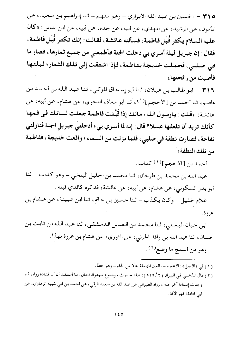316 - أَبُو طَالب بن غيلَان، ثَنَا أَبُو إِسْحَاق الْمُزَكي، ثَنَا عبد الله بن أَحْمد بن عَاصِم، ثَنَا أَحْمد بن [الأحجم] ، ثَنَا أَبُو معَاذ النَّحْوِيّ، عَن هِشَام، عَن أَبِيه، عَن عَائِشَة: " قلت: يَا رَسُول الله، مَالك إِذا قبلت فَاطِمَة جعلت لسَانك فِي فمها كَأَنَّك تُرِيدُ أَن تلعقها عسلاً؟ قَالَ: إِنَّه لما أسرى بِي؛ أدخلني جِبْرِيل الْجنَّة فناولني تفاحة، فَصَارَت نُطْفَة فِي صلبي، فَلَمَّا نزلت من السَّمَاء؛ واقعت خَدِيجَة، ففاطمة من تِلْكَ النُّطْفَة ". أَحْمد بن [الأحجم] كَذَّاب. عبد الله بن مُحَمَّد بن طرخان، ثَنَا مُحَمَّد بن الْخَلِيل الْبَلْخِي - وَهُوَ كَذَّاب - ثَنَا أَبُو بدر السكونِي، عَن هِشَام، عَن أَبِيه، عَن عَائِشَة، فَذكره كَالَّذي قبله. غُلَام خَلِيل - وَكَانَ يكذب - ثَنَا حُسَيْن بن حَاتِم، ثَنَا ابْن عُيَيْنَة، عَن هِشَام بن عُرْوَة. ابْن حبَان البستي، ثَنَا مُحَمَّد بن الْعَبَّاس الدِّمَشْقِي، ثَنَا عبد الله بن ثَابت بن حسان، ثَنَا عبد الله بن وَاقد الحرني، عَن الثَّوْريّ، عَن هِشَام بن عُرْوَة بِهَذَا. وَهُوَ من أسمج مَا وضع.
