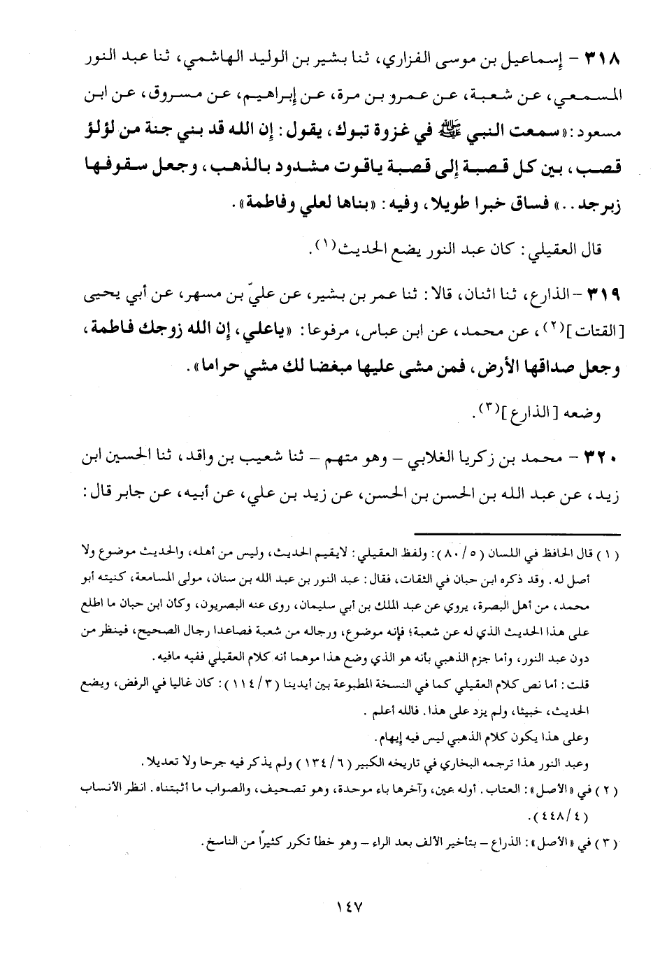 138 - إِسْمَاعِيل بن مُوسَى الْفَزارِيّ، ثَنَا بشير بن الْوَلِيد الْهَاشِمِي، ثَنَا عبد النُّور المسمعي، عَن شُعْبَة، عَن عَمْرو بن مرّة، عَن إِبْرَاهِيم، عَن مَسْرُوق، عَن ابْن مَسْعُود: " سَمِعت النَّبِي صلى الله عَلَيْهِ وَسلم فِي غَزْوَة تَبُوك، يَقُول: إِن الله قد بنى جنَّة من لُؤْلُؤ قصب، بَين كل قَصَبَة إِلَى قَصَبَة ياقوت مشدود بِالذَّهَب، وَجعل سقوفها زبرجد ... " فساق خَبرا طَويلا، وَفِيه: " بناها لعَلي وَفَاطِمَة ". قَالَ الْعقيلِيّ: كَانَ عبد النُّور يضع الحَدِيث.