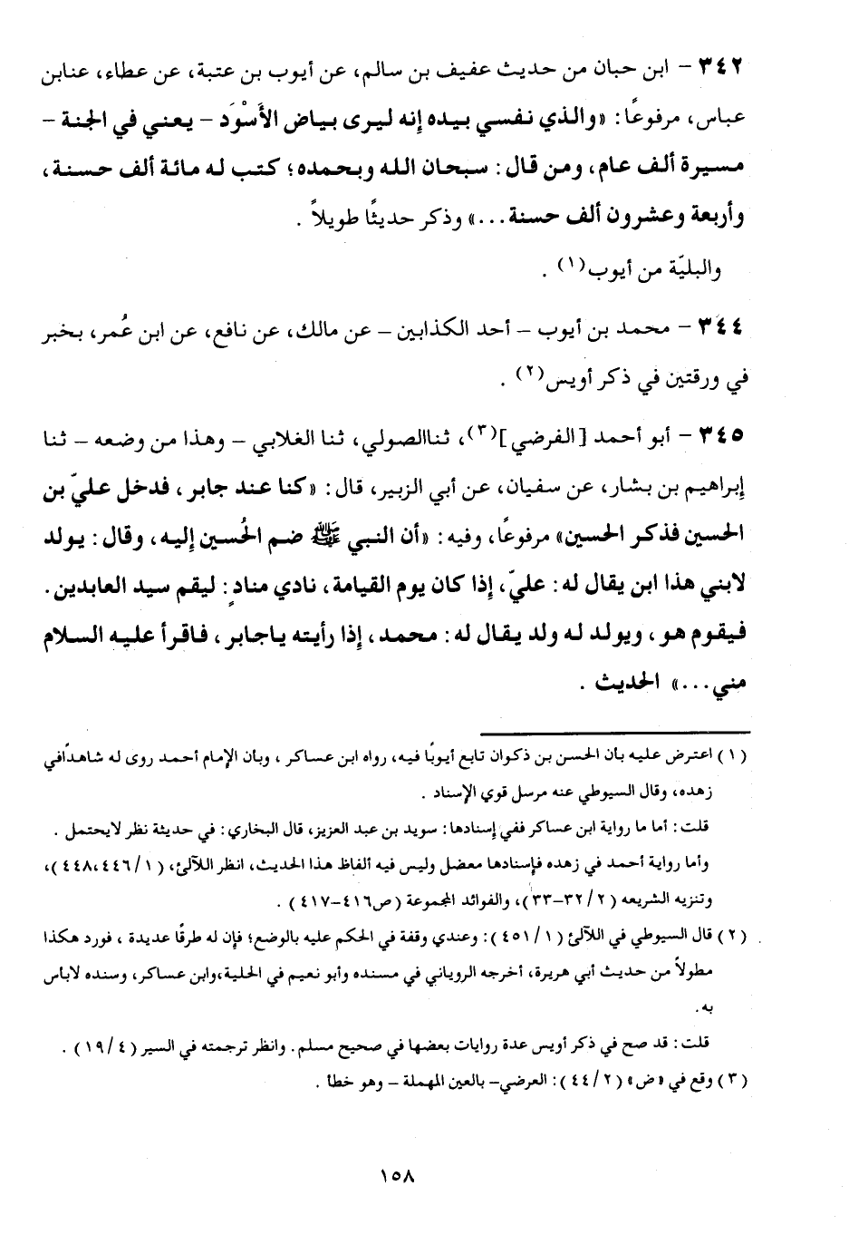 342 - ابْن حبَان من حَدِيث عفيف بن سَالم، عَن أَيُّوب بن عتبَة، عَن عَطاء، عَن ابْن عَبَّاس، مَرْفُوعا: " وَالَّذِي نَفسِي يسده إِنَّه ليرى بَيَاض الْأسود - يَعْنِي فِي الْجنَّة - مسيرَة ألف عَام، وَمن قَالَ: سُبْحَانَ الله وَبِحَمْدِهِ؛ كتب لَهُ مائَة ألف حَسَنَة، وَأَرْبَعَة وَعِشْرُونَ ألف حَسَنَة ... . " وَذكر حَدِيثا طَويلا. والبلية من أَيُّوب.