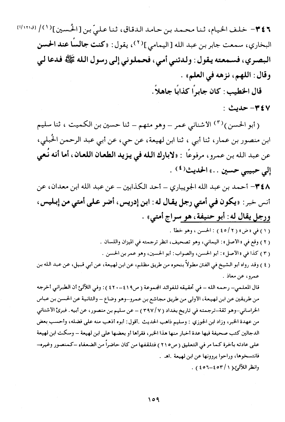 346 - خلف الْخيام، ثَنَا مُحَمَّد بن حَامِد الدقاق، ثَنَا عَليّ بن [الْحُسَيْن] / البُخَارِيّ، سَمِعت جَابر بن عبد الله [اليمامي] ، يَقُول: " كنت جَالِسا عِنْد الْحسن الْبَصْرِيّ، فَسَمعته يَقُول: ولدتني أُمِّي، فحملوني إِلَى رَسُول الله صلى الله عَلَيْهِ وَسلم فَدَعَا لي وَقَالَ: اللَّهُمَّ نزهه فِي الْعلم ". قَالَ الْخَطِيب: كَانَ جَابِرا كذابا جَاهِلا.