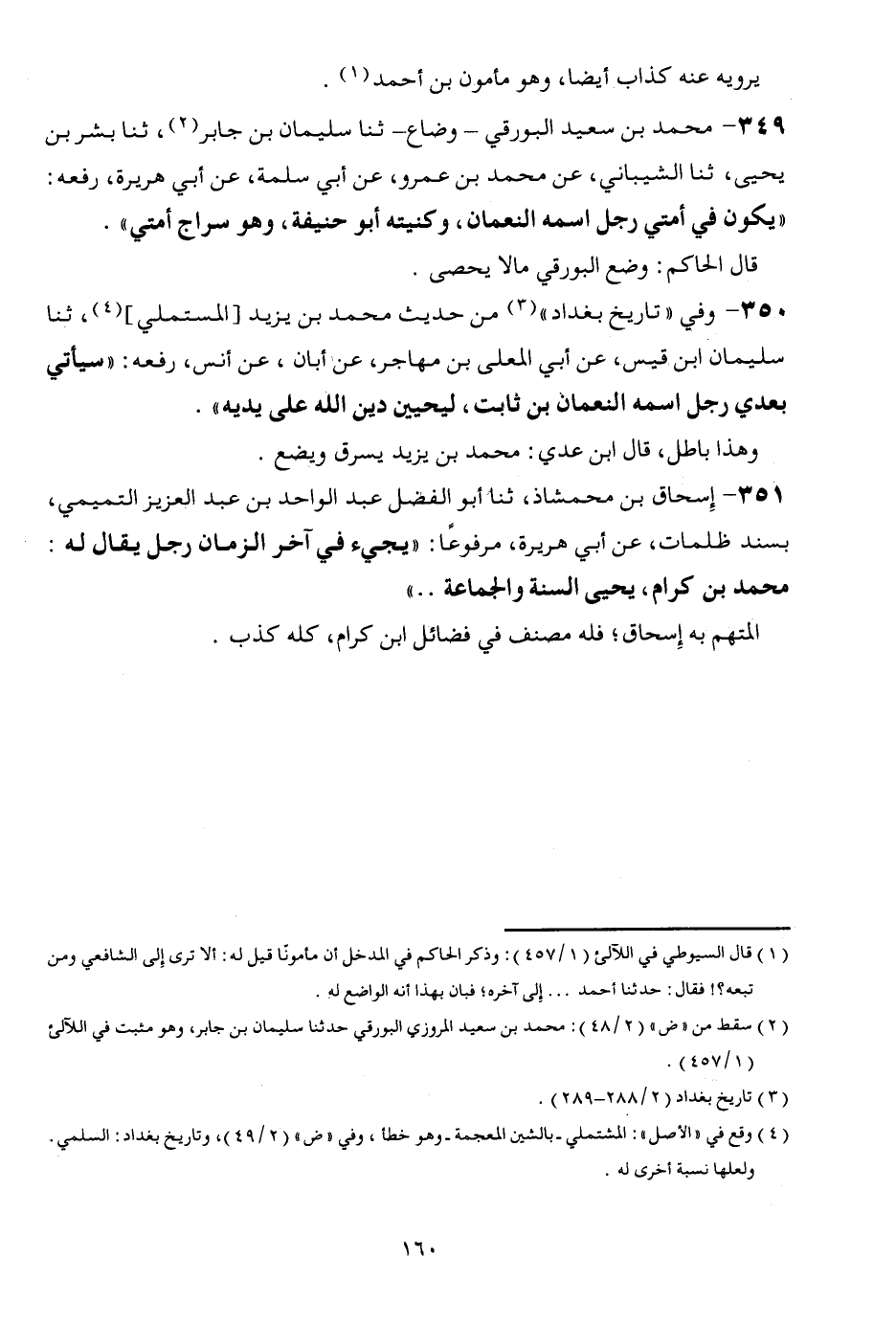 349 - مُحَمَّد بن سعيد البورقي - وَضاع - ثَنَا سُلَيْمَان بن جَابر، ثَنَا بشر بن يحيى، ثَنَا الشَّيْبَانِيّ، عَن مُحَمَّد بن عَمْرو، عَن أبي سَلمَة، عَن أبي هُرَيْرَة، رَفعه: " يكون فِي أمتِي رجل اسْمه النُّعْمَان، وكنيته أَبُو حنيفَة، وَهُوَ سراج أمتِي ". قَالَ الْحَاكِم: وضع البورقي مَالا يُحْصى.