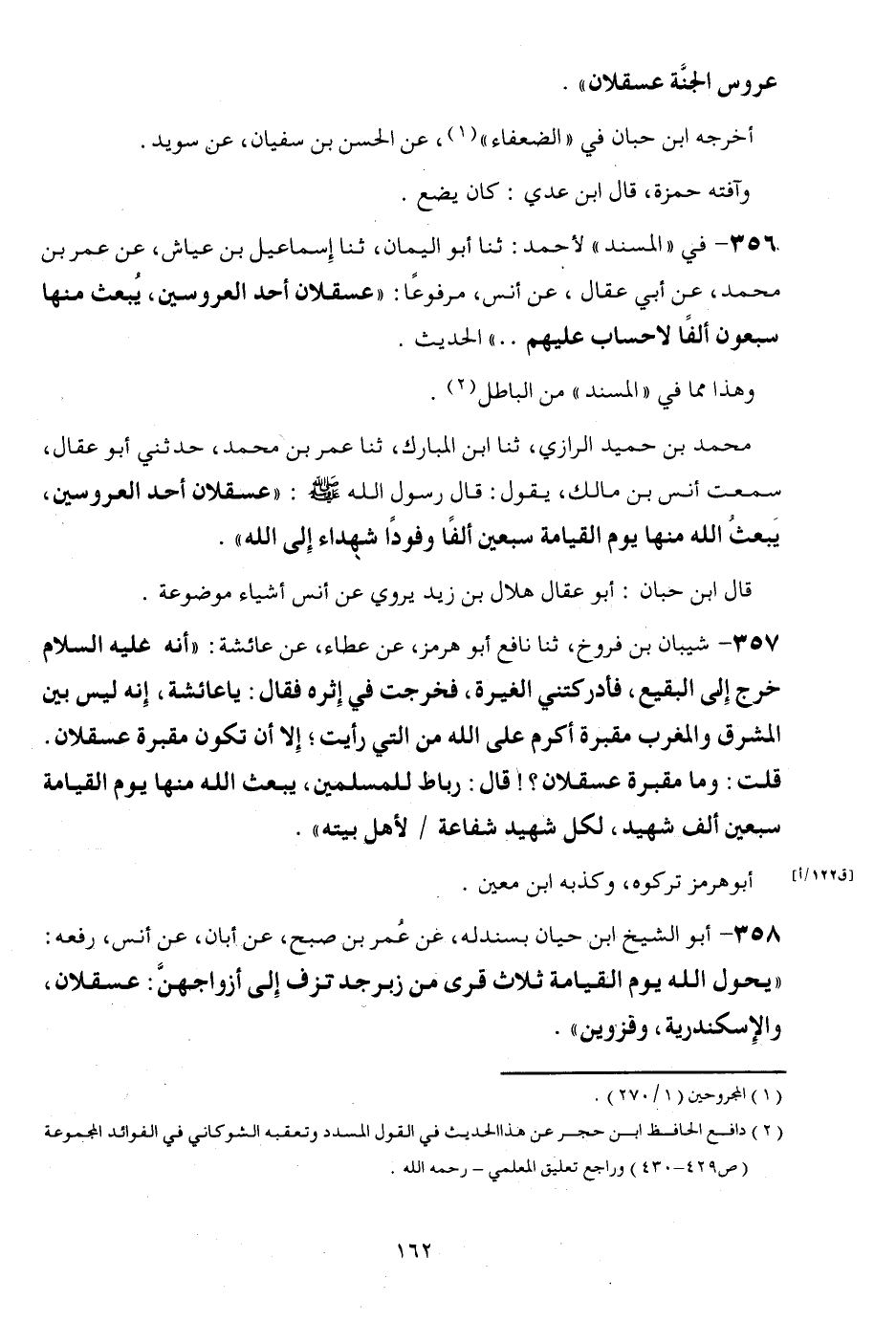 356 - فِي " الْمسند " لِأَحْمَد: ثَنَا أَبُو الْيَمَان، ثَنَا إِسْمَاعِيل بن عَيَّاش، عَن عمر بن مُحَمَّد، عَن أبي عقال، عَن أنس، مَرْفُوعا: " عسقلان أحد العروسين، يبْعَث مِنْهَا سَبْعُونَ ألفا لَا حِسَاب عَلَيْهِم ... " الحَدِيث. وَهَذَا مِمَّا فِي " الْمسند " من الْبَاطِل. مُحَمَّد بن حميد الرَّازِيّ، ثَنَا ابْن الْمُبَارك، ثَنَا عمر بن مُحَمَّد، حَدثنِي أَبُو عقال، سَمِعت أنس بن مَالك، يَقُول: قَالَ رَسُول الله صلى الله عَلَيْهِ وَسلم: " عسقلان أحد العروسين، يبْعَث الله مِنْهَا يَوْم الْقِيَامَة سبعين ألفا وفوداً شُهَدَاء إِلَى الله ". وَقَالَ ابْن حبَان: أَبُو عقال هِلَال بن زيد يروي عَن أنس أَشْيَاء مَوْضُوعَة.