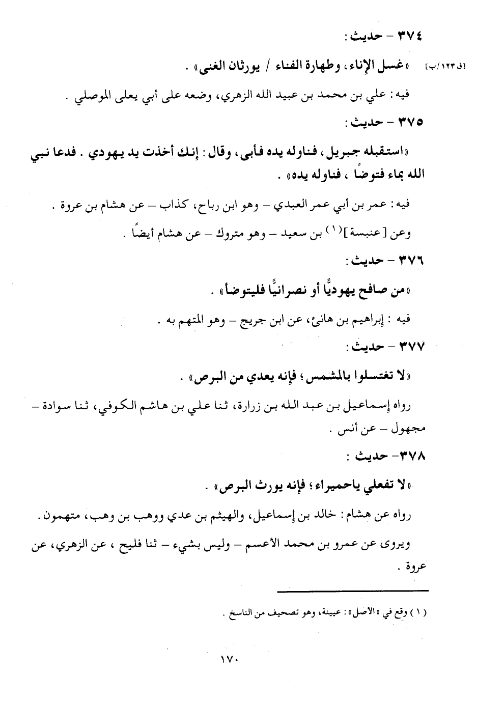 375 - حَدِيث: " استقبله جِبْرِيل، فَنَاوَلَهُ يَده فَأبى، وَقَالَ: إِنَّك أخذت يَد يَهُودِيّ. فَدَعَا نَبِي الله بِمَاء فَتَوَضَّأ، فَنَاوَلَهُ يَده ". فِيهِ: عمر بن أبي عمر الْعَبْدي - وَهُوَ ابْن رَبَاح، كَذَّاب - عَن هِشَام بن عُرْوَة. وَعَن [عَنْبَسَة] بن سعيد - وَهُوَ مَتْرُوك - عَن هِشَام أَيْضا.