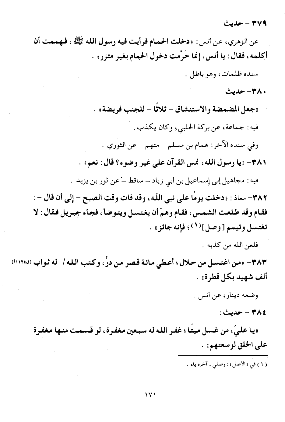 383 - " من اغْتسل من حَلَال؛ أعطي مائَة قصر من در، وَكتب الله / لَهُ ثَوَاب ألف شَهِيد بِكُل قَطْرَة ". وَضعه دِينَار، عَن أنس.