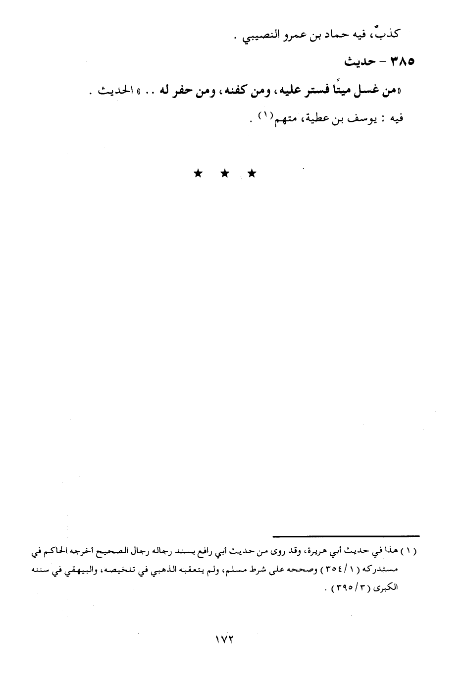 385 - حَدِيث: " من غسل مَيتا فَستر عَلَيْهِ، وَمن كَفنه، وَمن حفر لَهُ ... " الحَدِيث. فِيهِ: يُوسُف بن عَطِيَّة، مُتَّهم.
