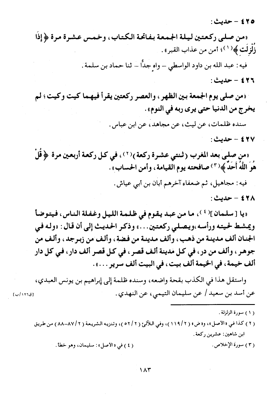 425 - حَدِيث: " من صلى الله عَلَيْهِ وَسلم رَكْعَتَيْنِ لَيْلَة الْجُمُعَة بِفَاتِحَة الْكتاب، وَخمْس عشرَة مرّة {إِذا زلزلت} ؛ أَمن من عَذَاب الْقَبْر ". فِيهِ: عبد الله بن دَاوُد الوَاسِطِيّ - واهٍ جدا - ثَنَا حَمَّاد بن سَلمَة.