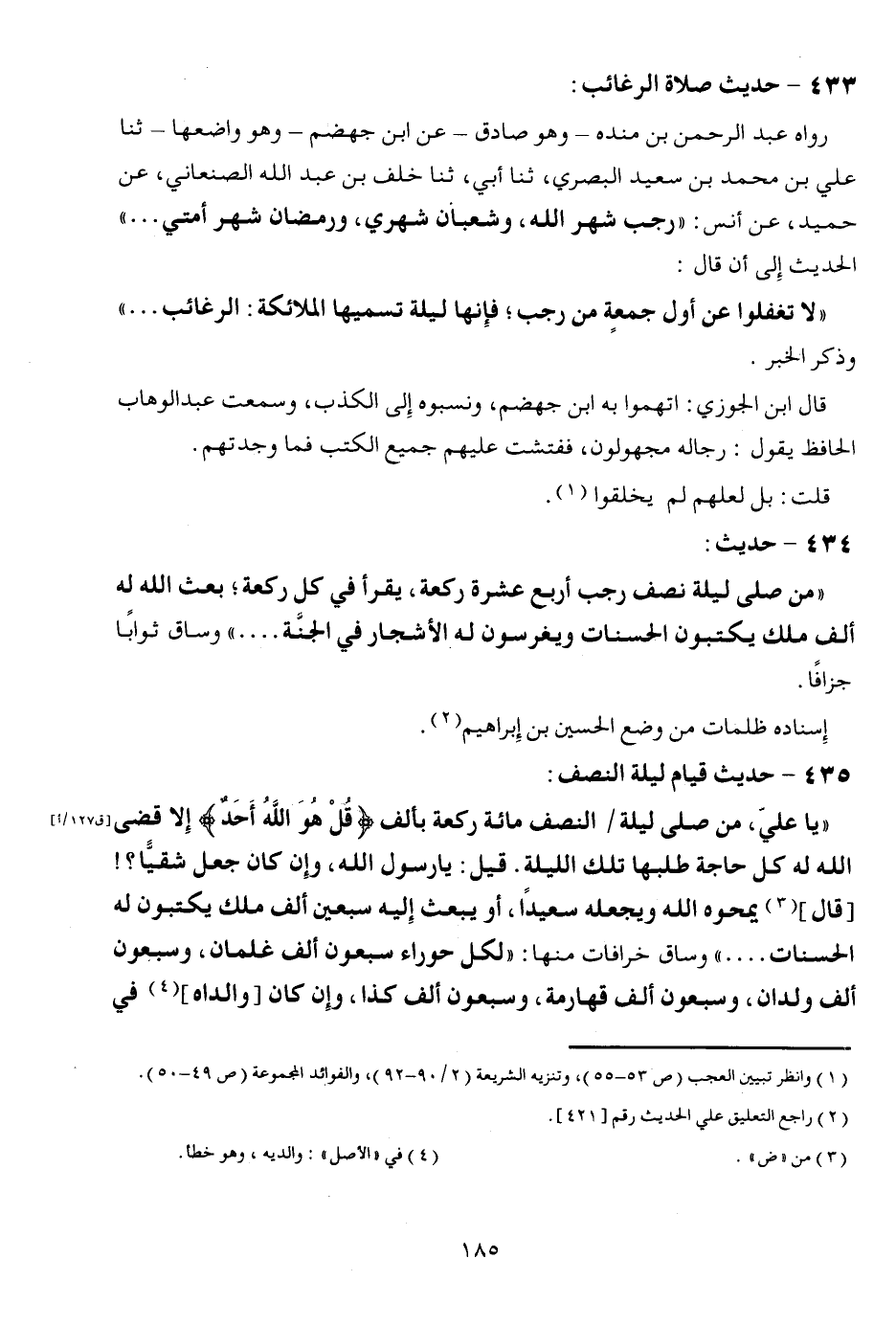 435 - حَدِيث قيام لَيْلَة النّصْف: " يَا عَليّ من صلى الله عَلَيْهِ وَسلم لَيْلَة / النّصْف مائَة رَكْعَة بِأَلف {قل هُوَ الله أحد} إِلَّا قضى الله لَهُ كل حَاجَة طلبَهَا تِلْكَ اللَّيْلَة. قيل: يَا رَسُول الله، وَإِن كَانَ جعل شقياً؟ ! [قَالَ] يمحوه الله ويجعله سعيداً، أَو يبْعَث إِلَيْهِ سبعين ألف ملك يَكْتُبُونَ لَهُ الْحَسَنَات ... " وسَاق خرافات مِنْهَا: " لكل حوراء سَبْعُونَ ألف غلْمَان، وَسَبْعُونَ ألف ولدان، وَسَبْعُونَ ألف قهارمة، وَسَبْعُونَ ألف كَذَا، وَإِن كَانَ [وَالِده] فِي