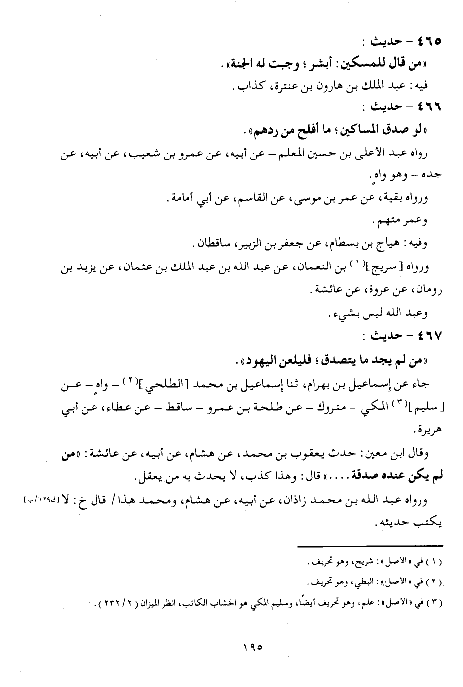 466 - حَدِيث: " لَو صدق الْمَسَاكِين؛ مَا أَفْلح من ردهم ". رَوَاهُ عبد الْأَعْلَى بن حُسَيْن الْمعلم - عَن أَبِيه، عَن عَمْرو بن شُعَيْب، عَن أَبِيه، عَن جده - وَهُوَ واهٍ. وَرَوَاهُ بَقِيَّة، عَن عمر بن مُوسَى، عَن الْقَاسِم، عَن أبي أُمَامَة. وَعمر مُتَّهم. وَفِيه: هياج بن بسطَام، عَن جَعْفَر بن الزبير، ساقطان. وَرَوَاهُ [سُرَيج] بن النُّعْمَان، عَن عبد الله بن عبد الْملك بن عُثْمَان، عَن يزِيد بن رُومَان، عَن عُرْوَة، عَن عَائِشَة. وَعبد الله لَيْسَ بِشَيْء.