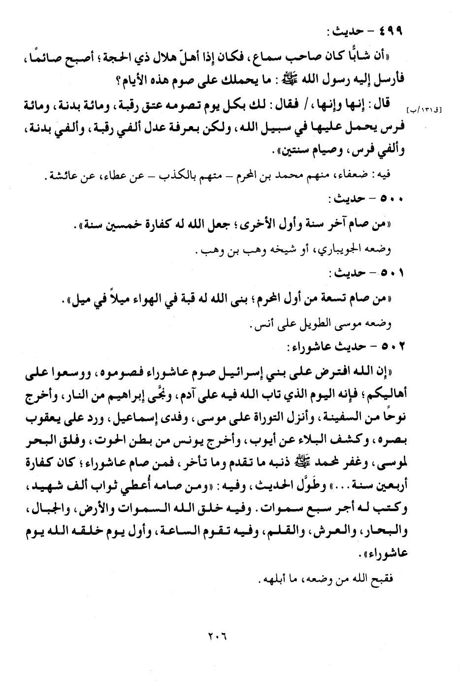 502 - حَدِيث عَاشُورَاء: " إِن الله افْترض على بني إِسْرَائِيل صَوْم عَاشُورَاء فصوموه، ووسعوا على أهاليكم؛ فَإِنَّهُ الْيَوْم الَّذِي تَابَ الله فِيهِ على آدم، ونجى إِبْرَاهِيم من النَّار، وَأخرج نوحًا من السَّفِينَة، وَأنزل التَّوْرَاة على مُوسَى، وفدى إِسْمَاعِيل، ورد على يَعْقُوب بَصَره، وكشف الْبلَاء عَن أَيُّوب، وَأخرج يُونُس من بطن الْحُوت، وفلق الْبَحْر لمُوسَى، وَغفر لمُحَمد صلى الله عَلَيْهِ وَسلم ذَنبه مَا تقدم وَمَا تَأَخّر، فَمن صَامَ عَاشُورَاء؛ كَانَ كَفَّارَة أَرْبَعِينَ سنة. . " وَطول الحَدِيث، وَفِيه: " وَمن صَامَهُ أعطي ثَوَاب ألف شَهِيد، وَكتب لَهُ أجر سبع سموات. وَفِيه خلق الله السَّمَوَات وَالْأَرْض، وَالْجِبَال، والبحار، وَالْعرش، والقلم، وَفِيه تقوم السَّاعَة، وَأول يَوْم خلقه الله يَوْم عَاشُورَاء ". فقبح الله من وَضعه، وَمَا أبلهه.