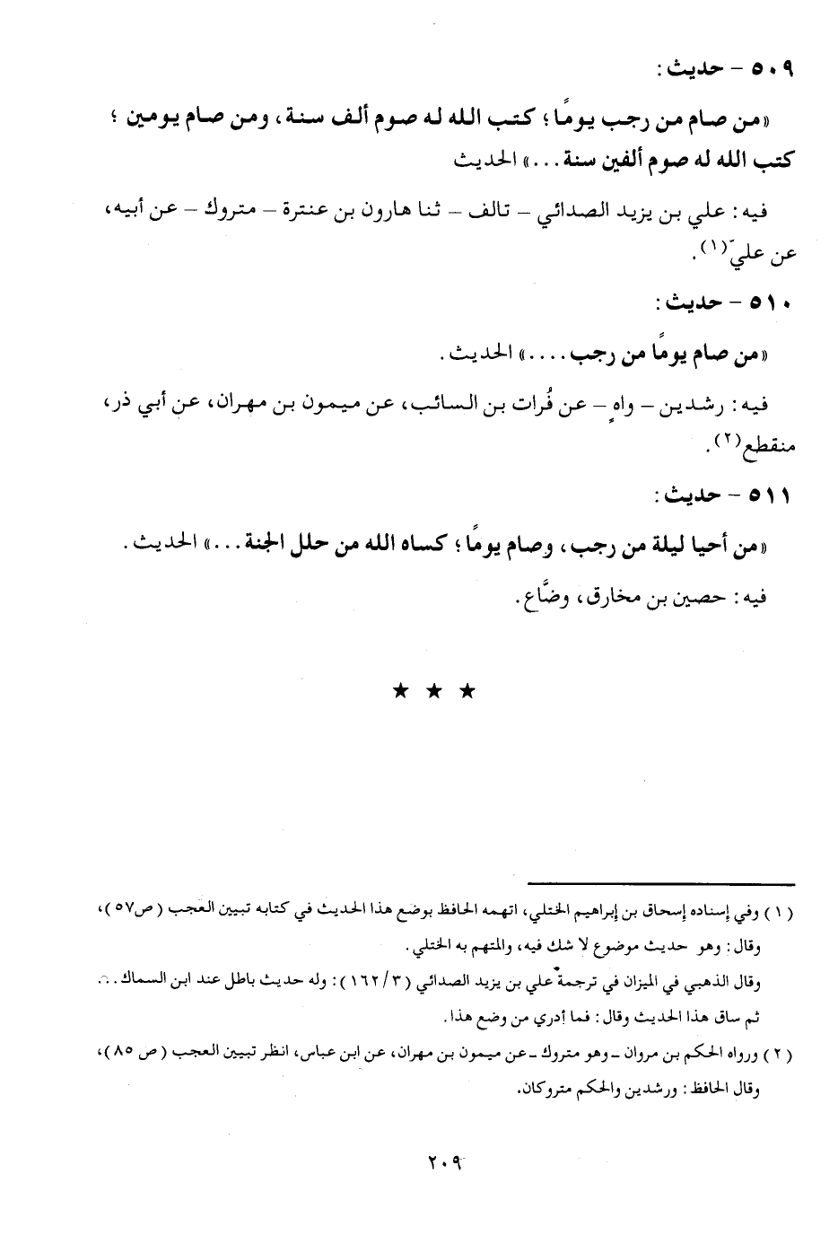 509 - حَدِيث: " من صَامَ من رَجَب يَوْمًا؛ كتب الله لَهُ صَوْم ألف سنة، وَمن صَامَ يَوْمَيْنِ؛ كتب الله لَهُ صَوْم أَلفَيْنِ سنة ... " الحَدِيث. فِيهِ: عَليّ ين يزِيد الصدائي - تَالِف - ثَنَا هَارُون بن عنترة - مَتْرُوك - عَن أَبِيه، عَن عَليّ.