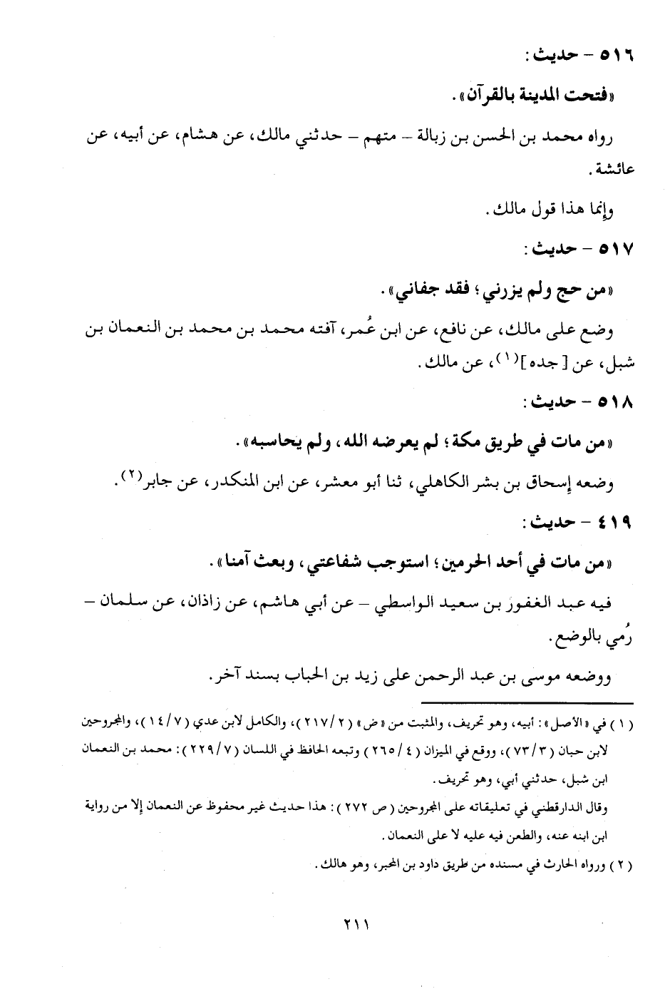 516 - حَدِيث: " فتحت الْمَدِينَة بِالْقُرْآنِ ". رَوَاهُ مُحَمَّد بن الْحسن بن زبالة - مُتَّهم - حَدثنِي مَالك، عَن هِشَام، عَن أَبِيه، عَن عَائِشَة. وَإِنَّمَا هَذَا قَول مَالك.