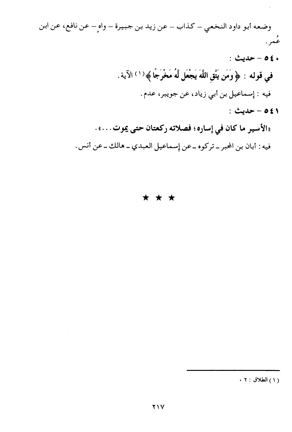 540 - حَدِيث: فِي قَوْله: " وَمن يتق الله يَجْعَل لَهُ مخرجا " الْآيَة. فِيهِ: إِسْمَاعِيل بن أبي زِيَاد، عَن جُوَيْبِر، عدم.